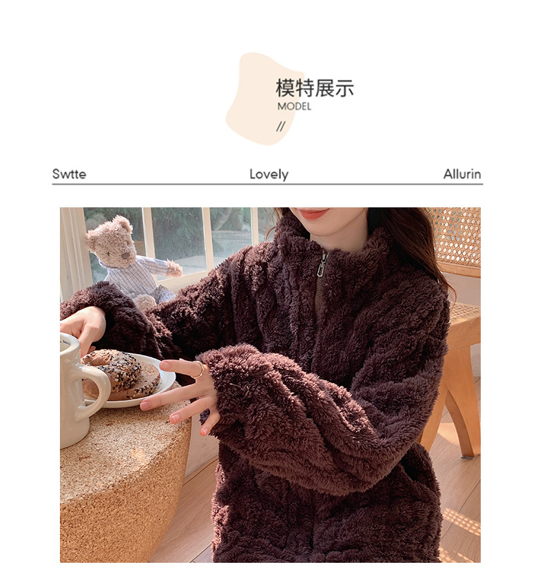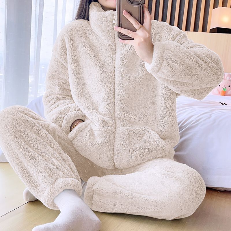レイジースタイルスタンドカラープラスベルベット厚みのあるホーム服ツーピース暖かいスーツ韓国版無地ルーズパジャマ2025冬
