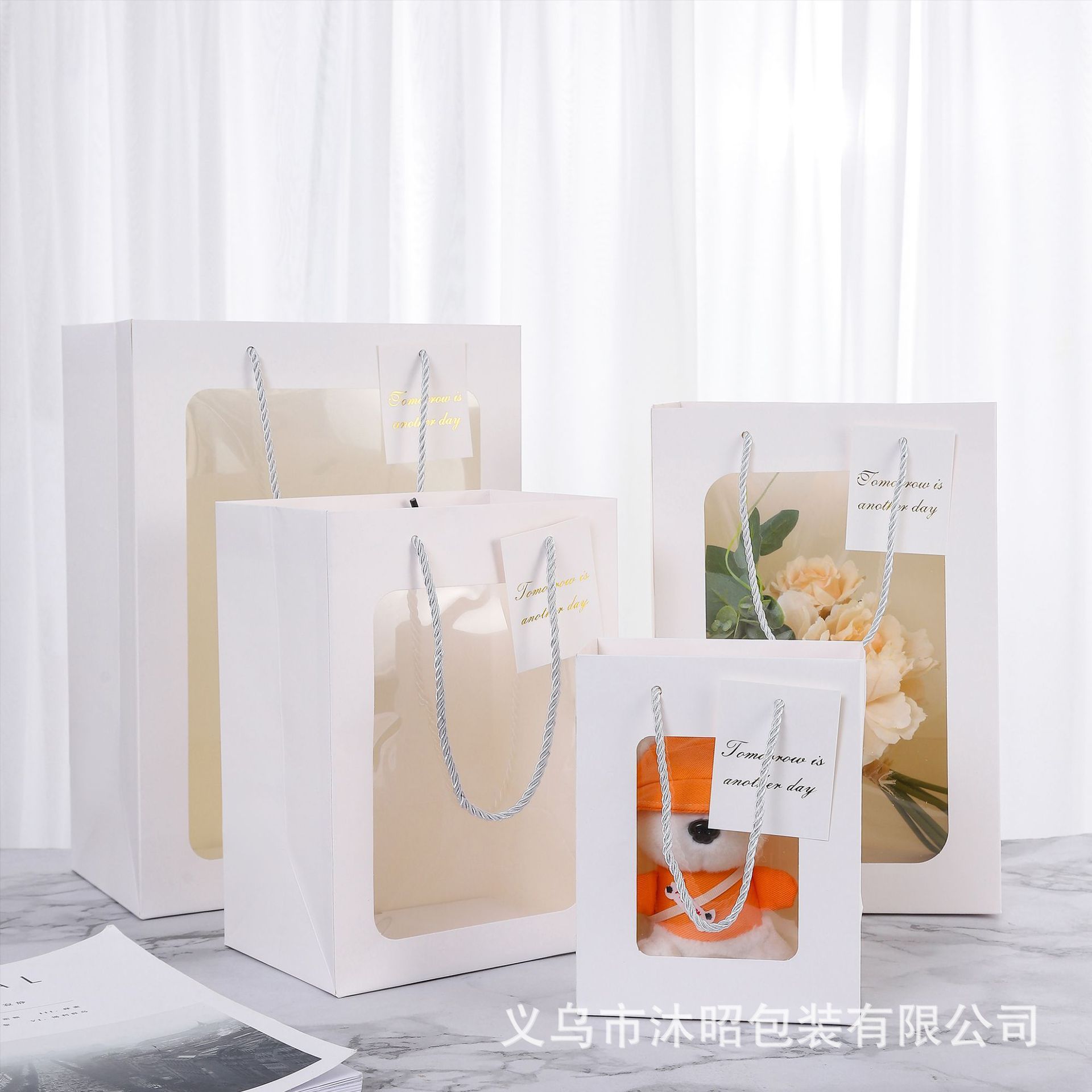 現物正方形開窓透明ギフトバッグ教師の日花ギフトバッグ人形包装白カード卸売り手提げ袋