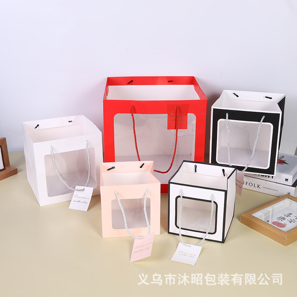 正方形紙袋透明ショーウインドー手提げ袋花人形焙煎ギフトバッグ包装お土産ケーキプレゼント