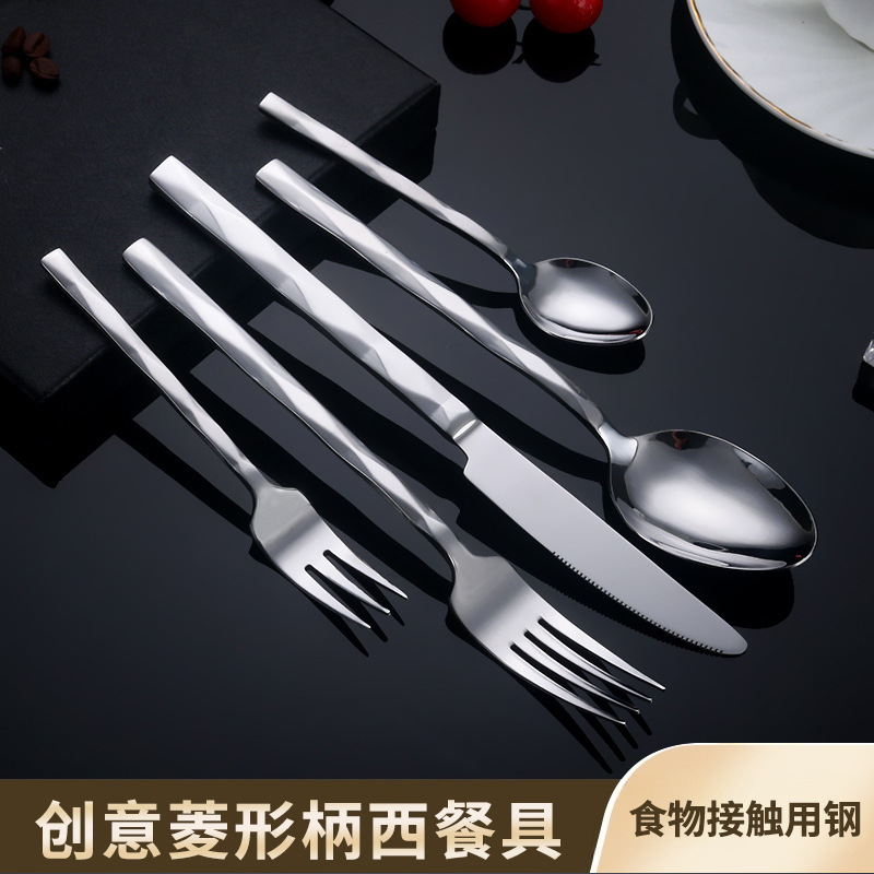 国境を越えて人気のあるステンレスステーキのナイフフォークスプーンのアイデアの四角い柄の菱の厚い柄の家庭用高級ホテルの洋食食器
