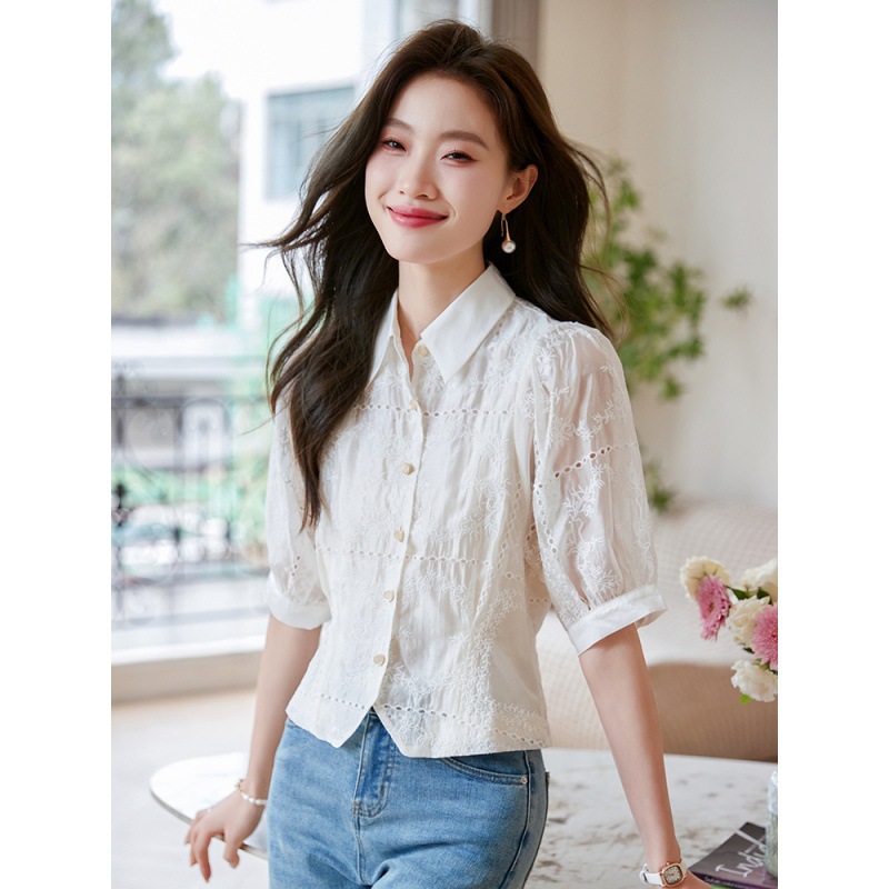 軽い贅沢なコンビネーションのシルクのシフォンのシャツの女性の2024年の夏のフランス式の透かし彫りの小さいシャツの泡の袖の襟の上着