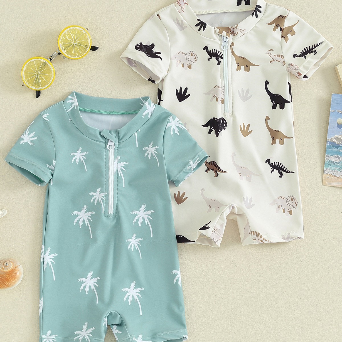 70-80-90-100-110子供の子供の小さい恐竜のココナッツの木のプリントの水着