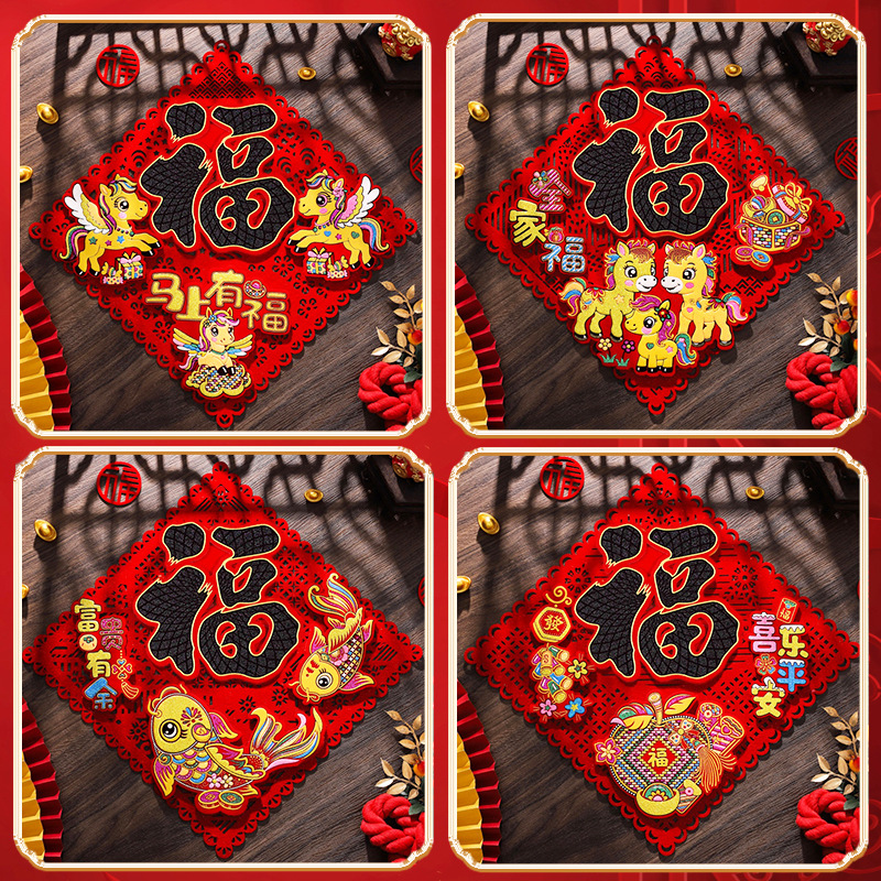 2026年馬年立体フェルト製福文字ドアステッカー、全面粘着式福文字ステッカー、新年飾り、春節用品、年画卸売商品