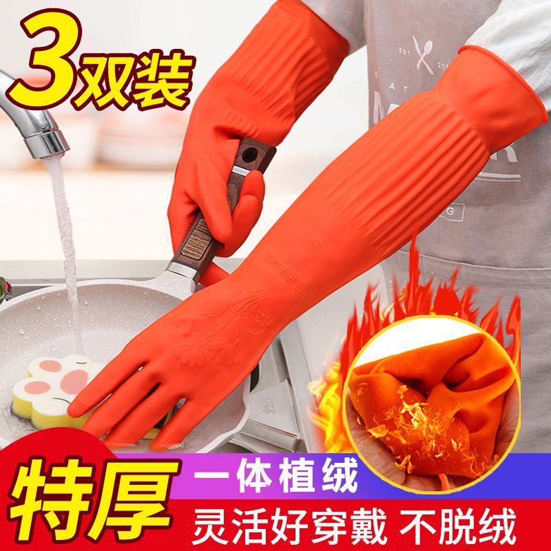 食器洗い手袋女性キッチン耐久性家庭用防水ベルベット厚いゴムゴム皮延長冬保温洗濯