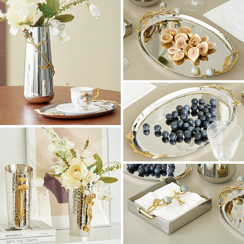 軽くて豪華な装飾品のステンレスの銀色の楕円の長いトレーの銀杏の枝葉の取っ手の水筒の花瓶のナプキンの棚の置物