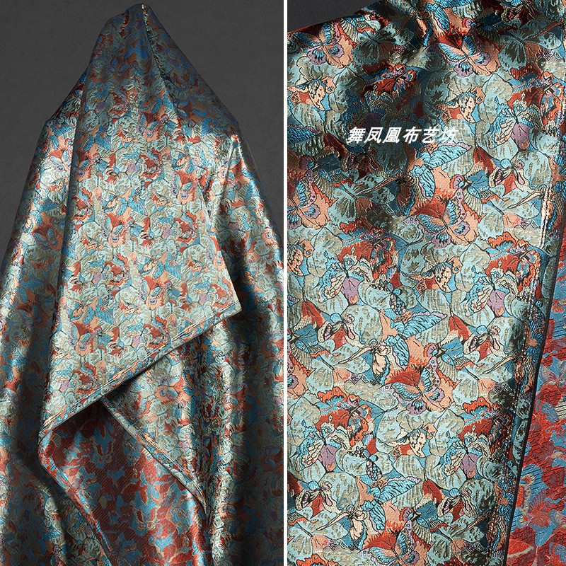 敦煌の花の蝶の夢のカラーの明るい糸のジャカードの筋の理屈の形の風衣の上着のチャイナドレスの服装のデザイナーの生地