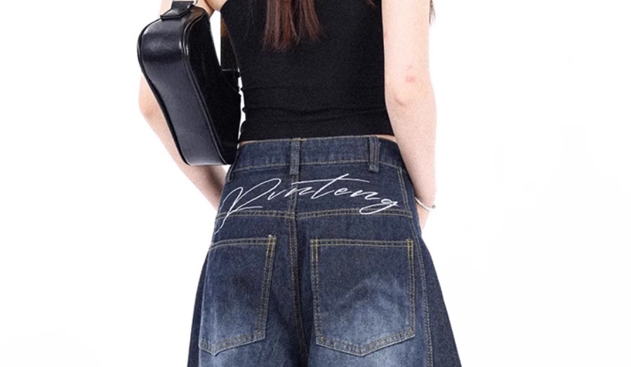 街头复古星星字母刺绣牛仔裤女美式小众设计感直筒宽松阔腿长裤子