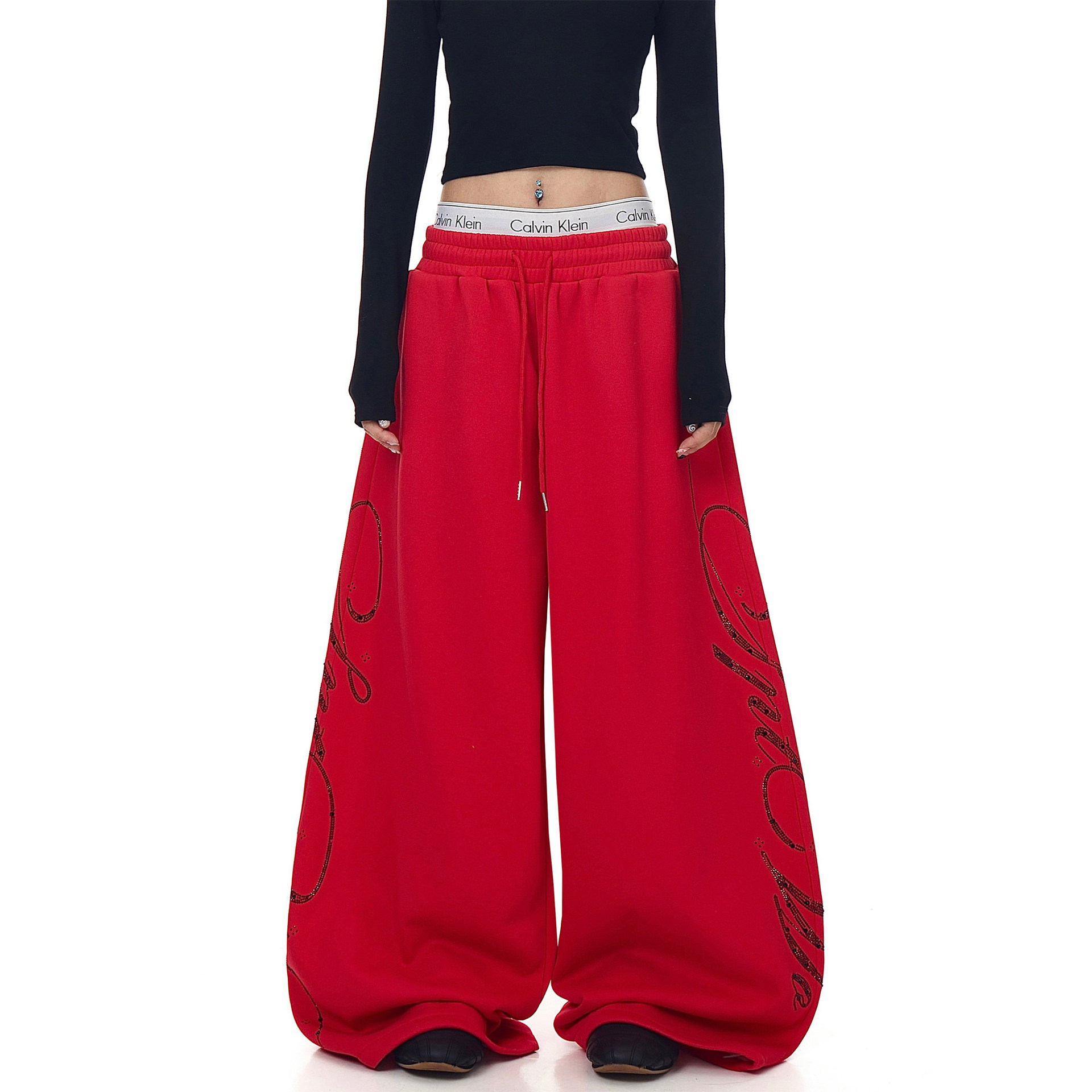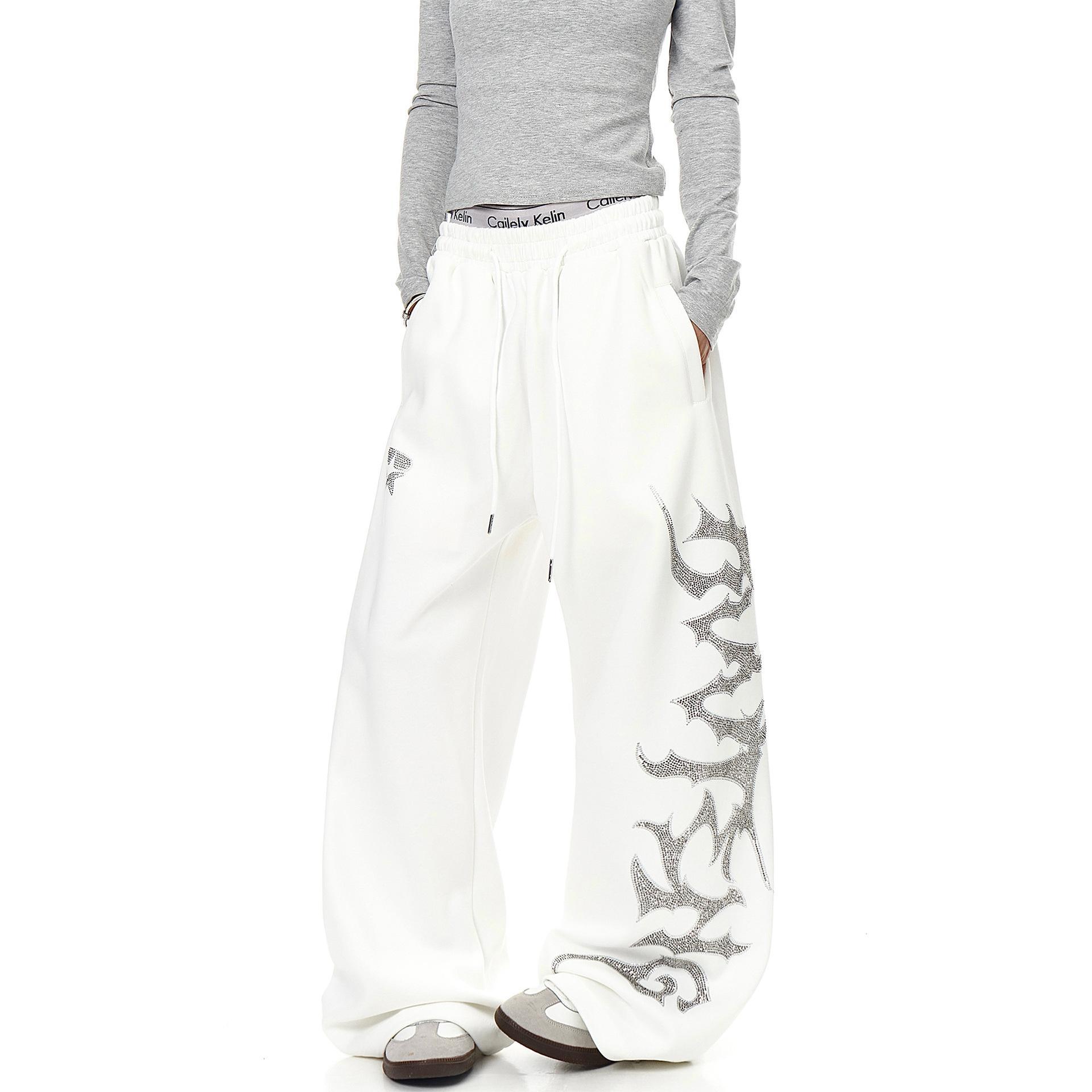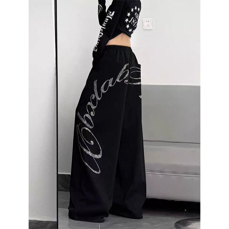 女装复古重工字母烫钻休闲裤直筒卫裤爵士舞宽松阔腿长裤子ins潮