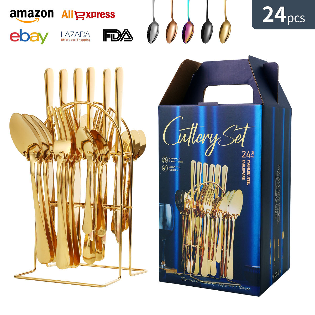 クロスボーダー1010ステンレス食器セット(ナイフ、フォーク、スプーン)24点セットギフトボックス入り、クリエイティブなチタンメッキ洋食ステーキナイフとフォーク
