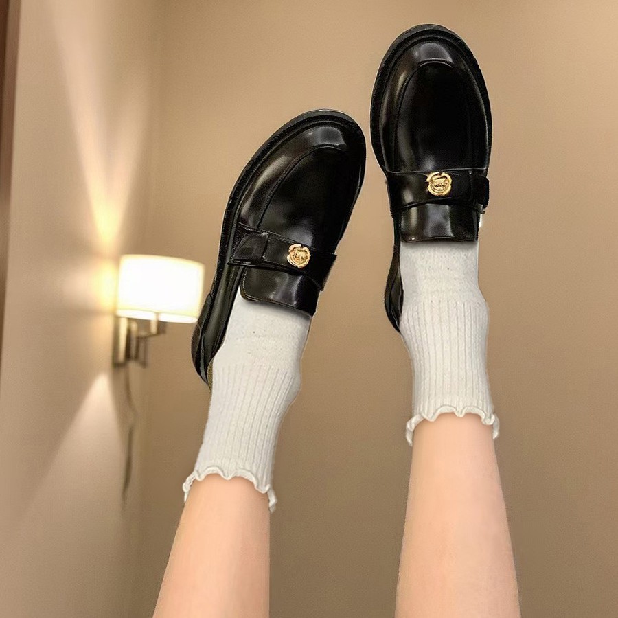 羊皮版~真皮山茶花金扣圆头一脚蹬粗跟乐福鞋女英伦风小皮鞋单鞋