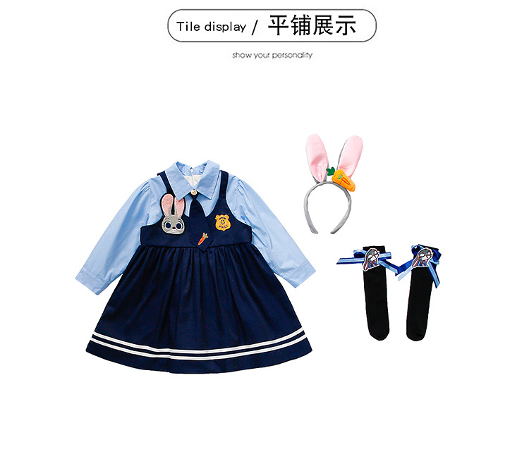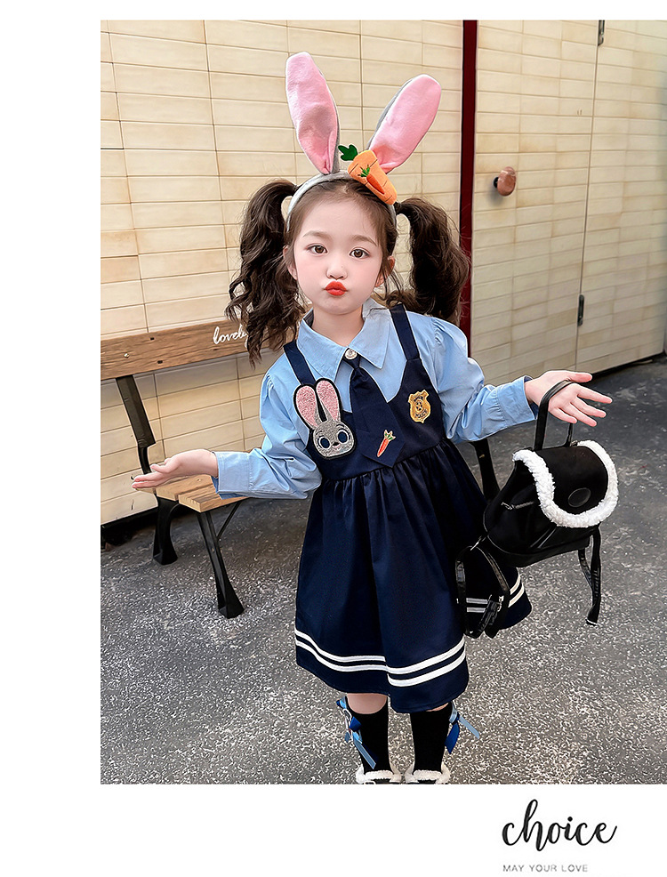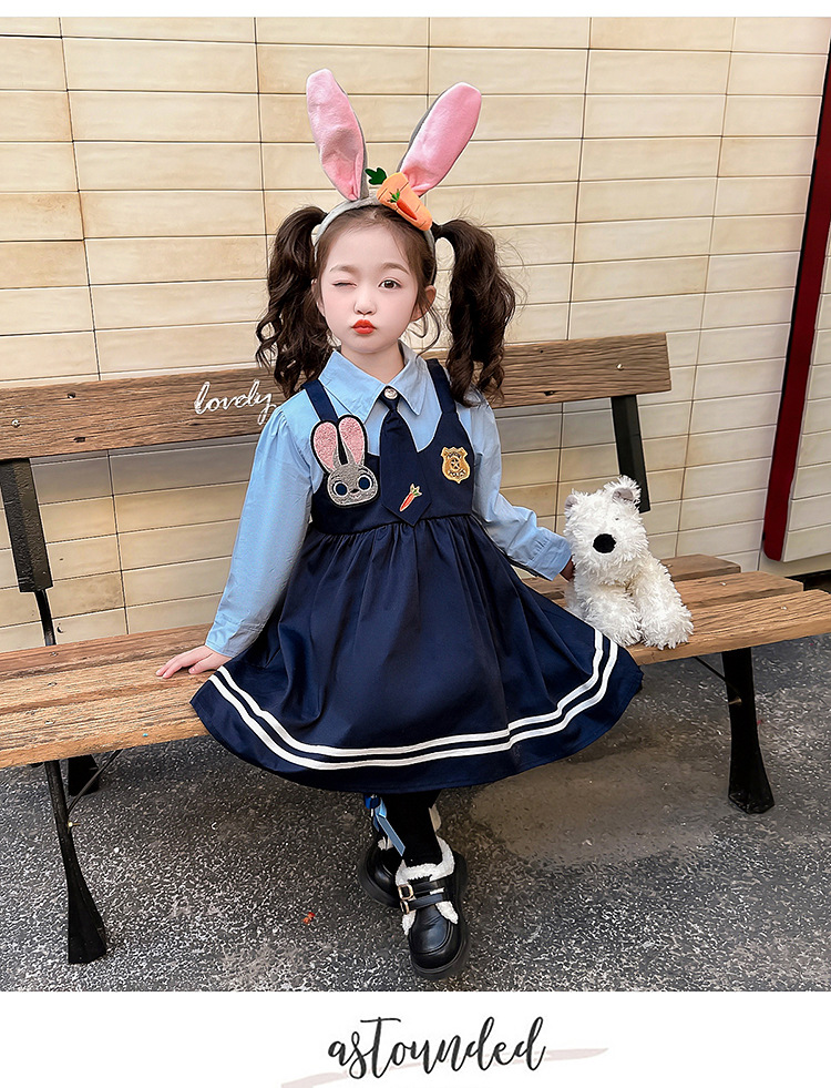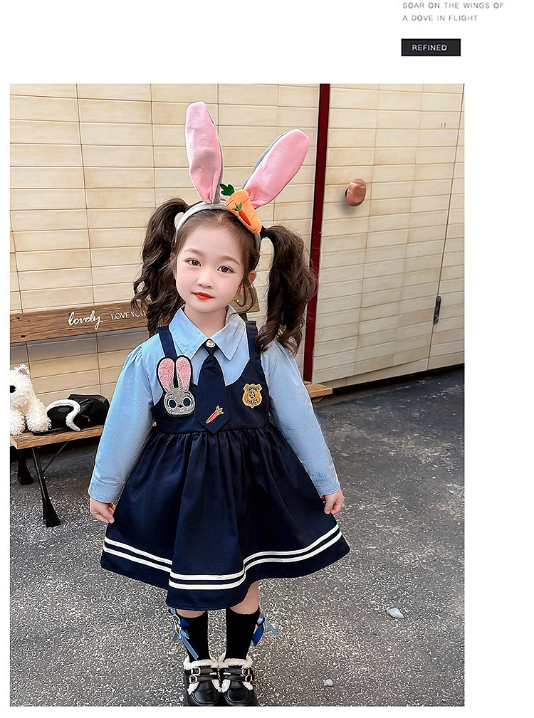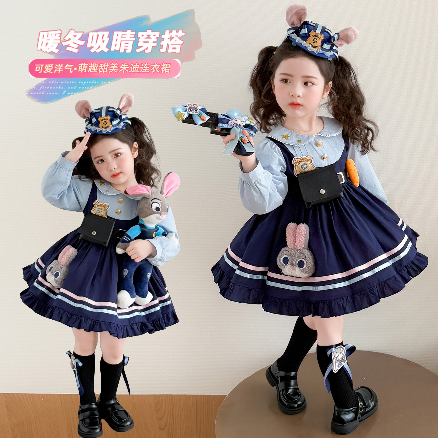 ブルーのノンベルベットスカート,ピンクのヘアアクセサリー,黒い靴下,大きな青い帽子,青い小さな帽子