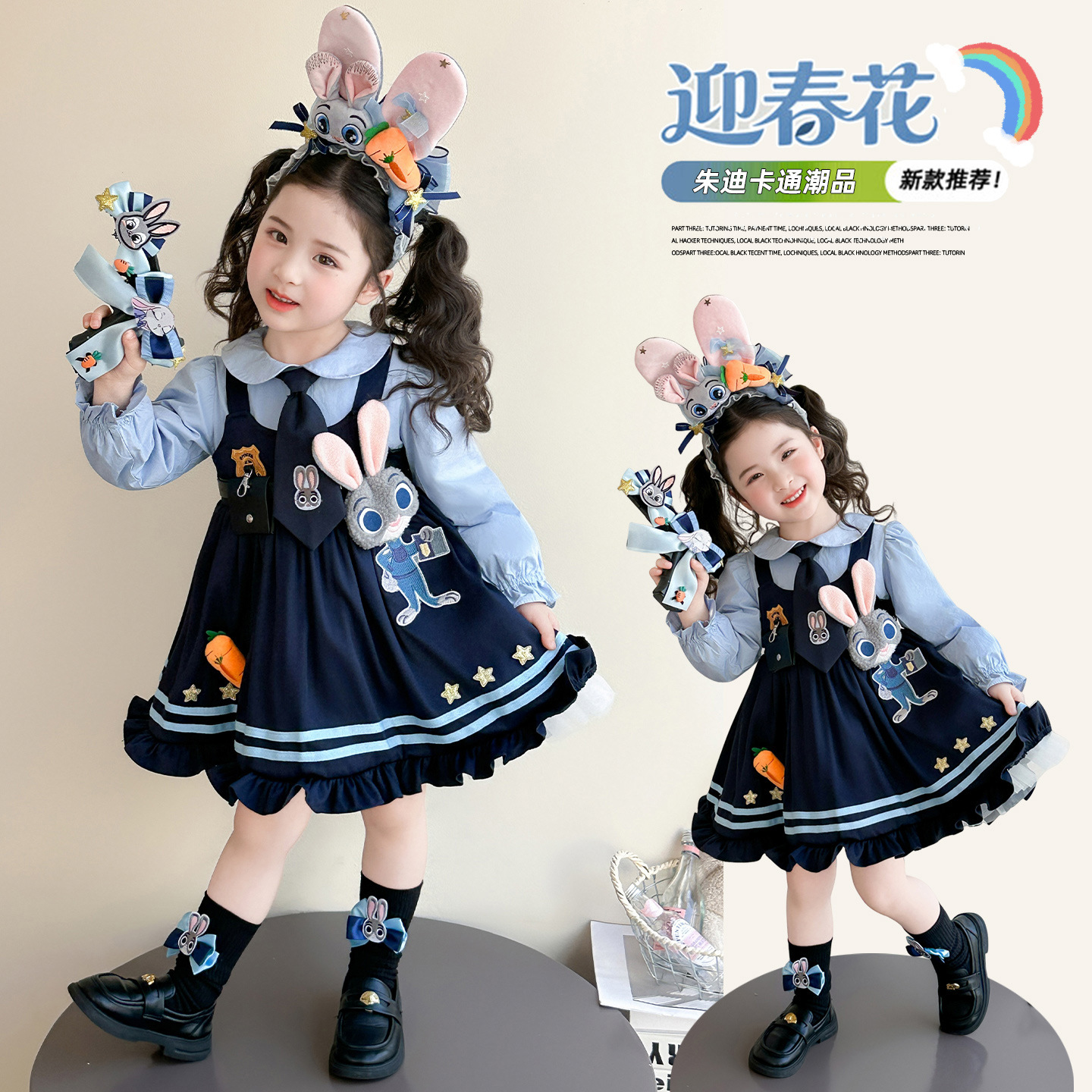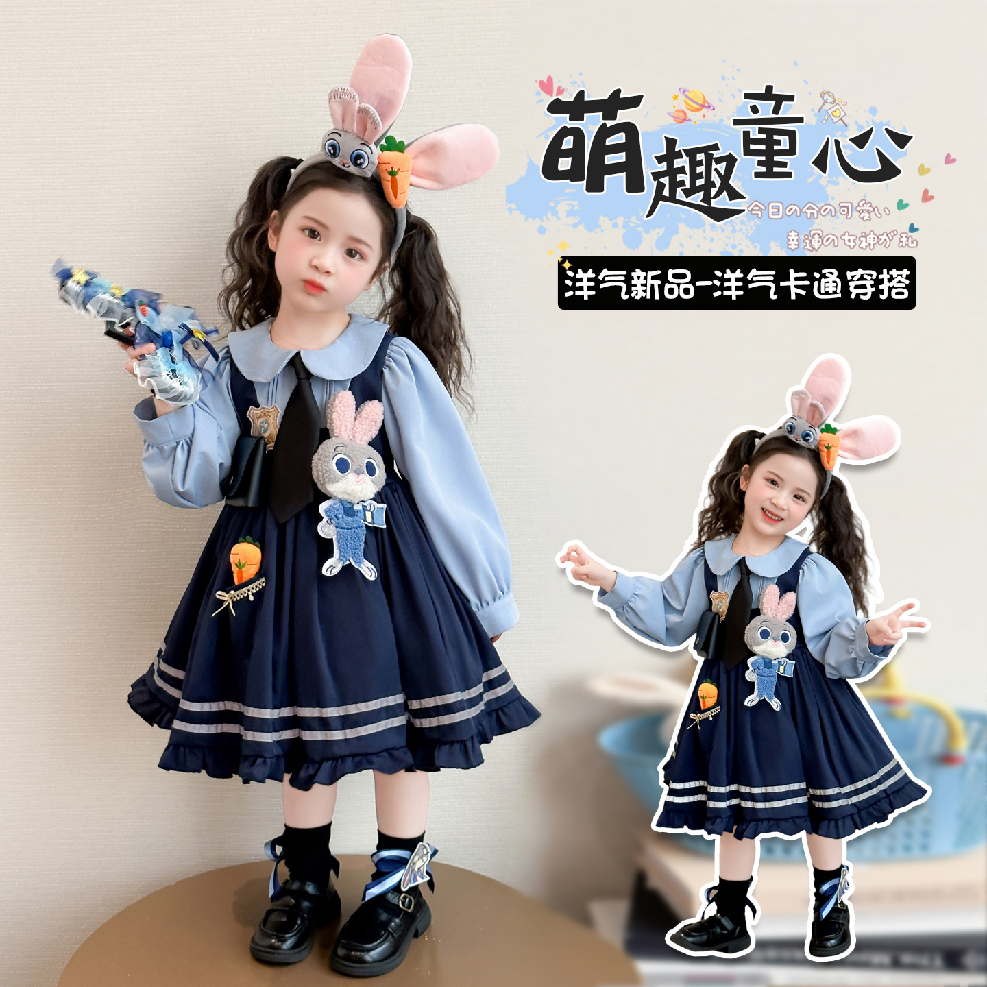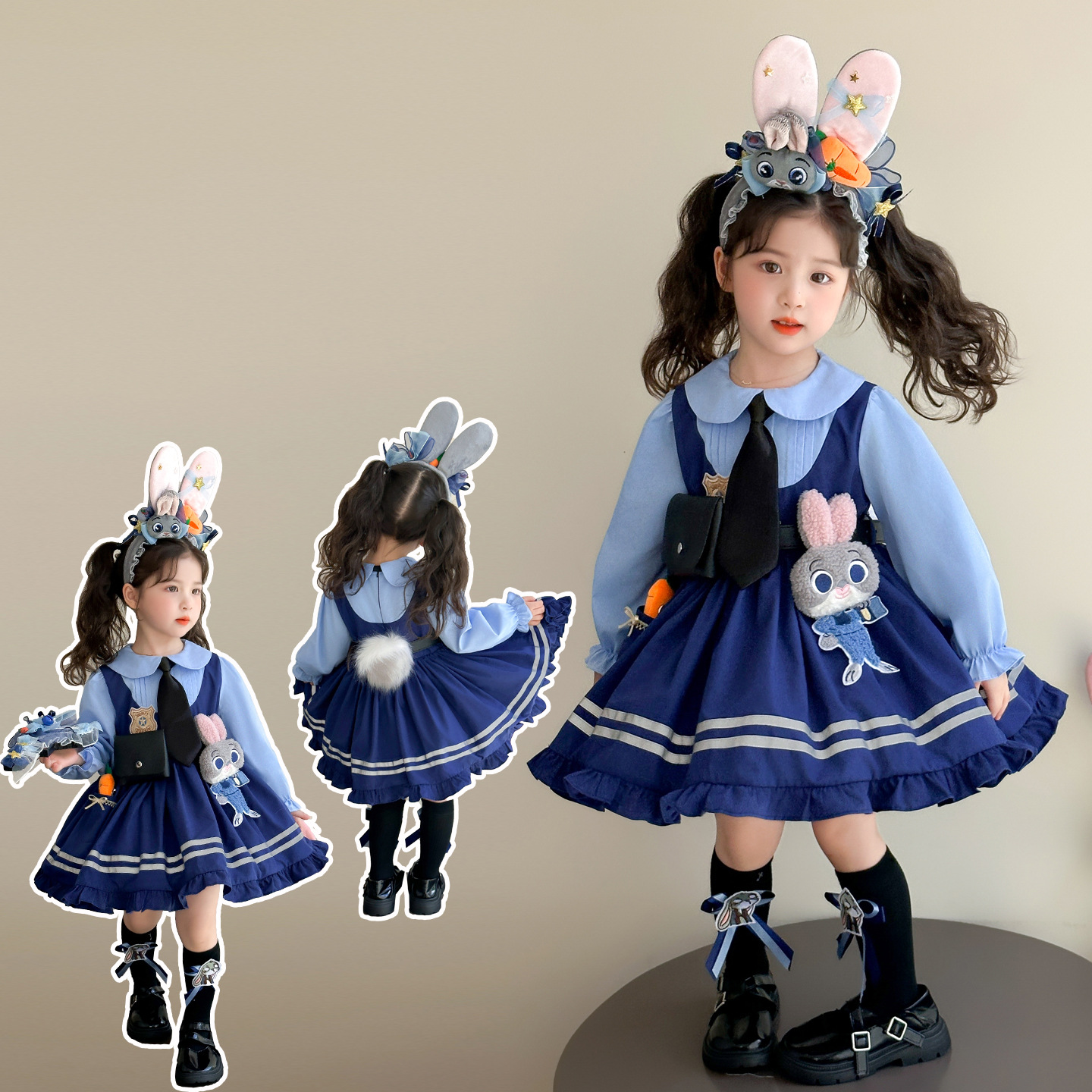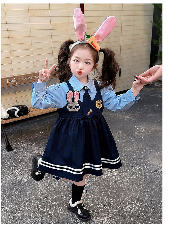 ブルーのノンベルベットスカート,ピンクのヘアアクセサリー,黒い靴下,大きな青い帽子,青い小さな帽子