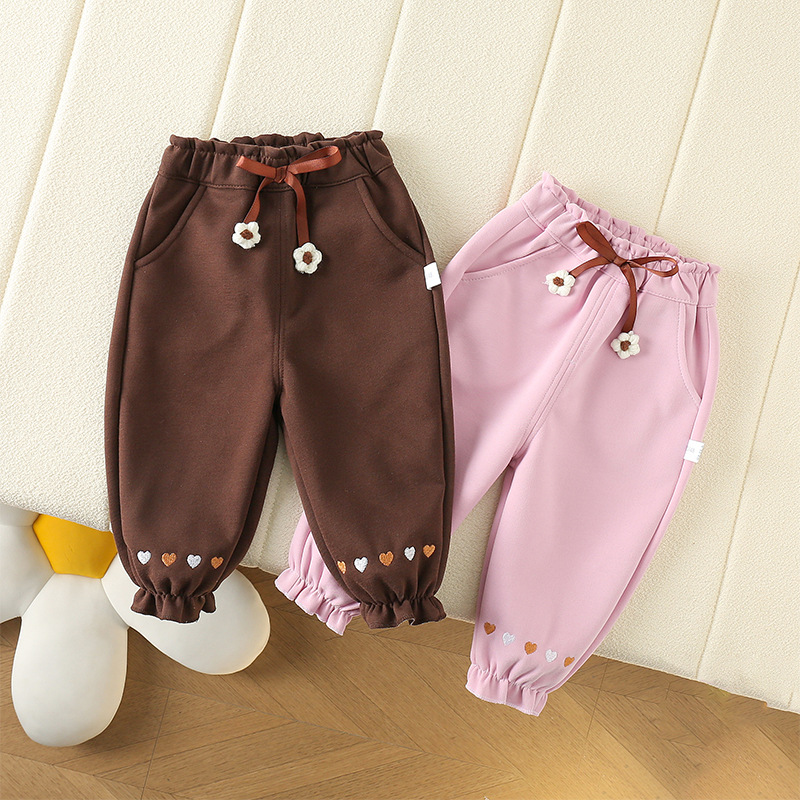 子供用の新しい冬用ベルベットパンツ、厚手のワンピースアウタースポーツパンツ、刺繍入りリボン付きスウェットパンツ、暖かい冬用