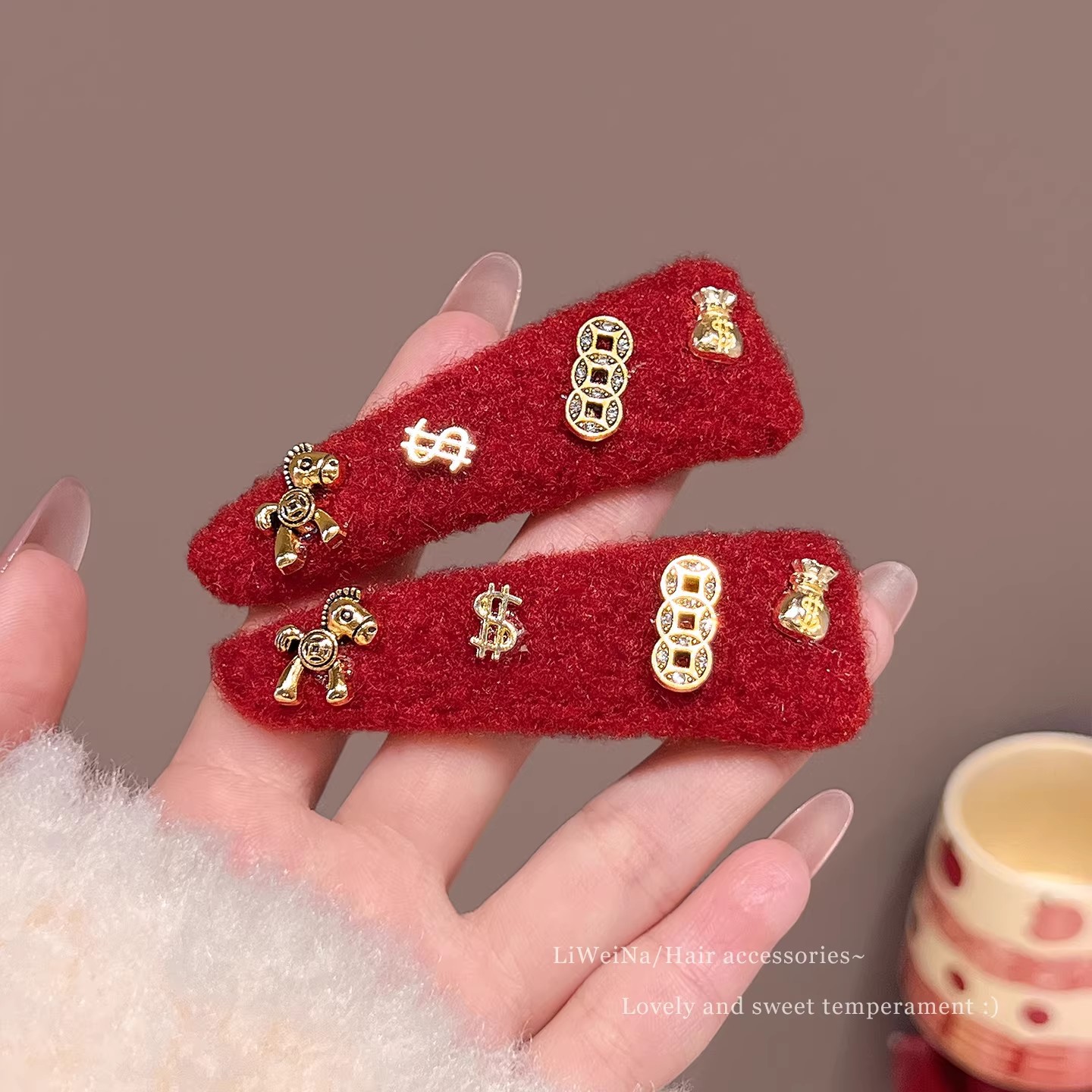 新年红色毛毡发夹BB夹马上有钱侧边夹刘海碎发夹新款掰掰夹发卡