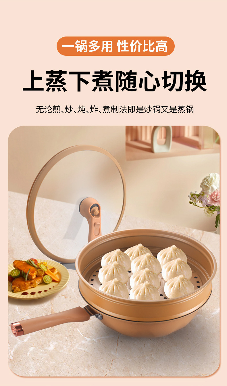 平底不粘锅养生锅健康炒锅蒸笼一体锅炒菜锅通用锅具批发多功能