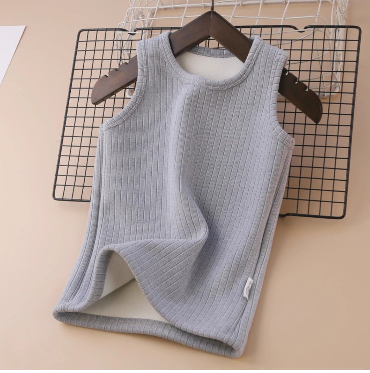 春と秋に着用できる、裏起毛で厚手の白いインナーウェア、保温性のある女の子用ベスト、男の子用文字入りノースリーブベスト。
