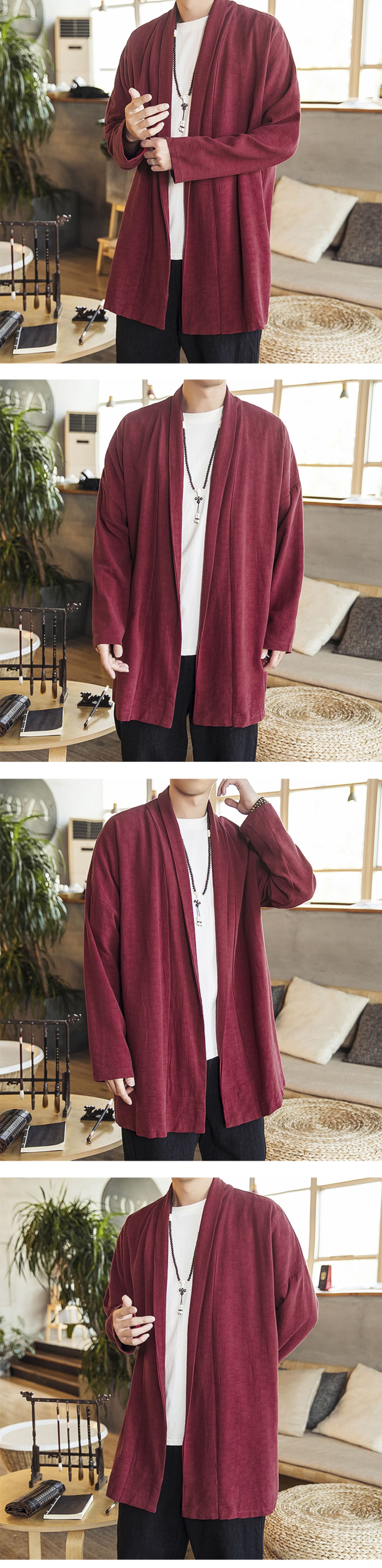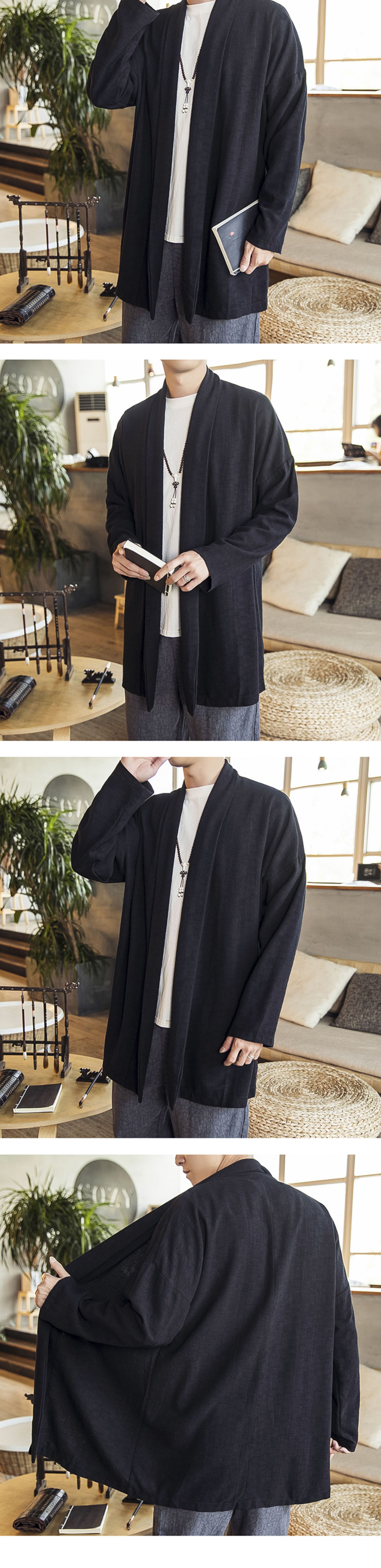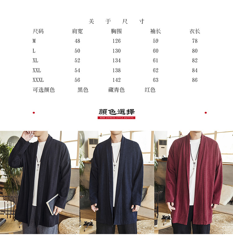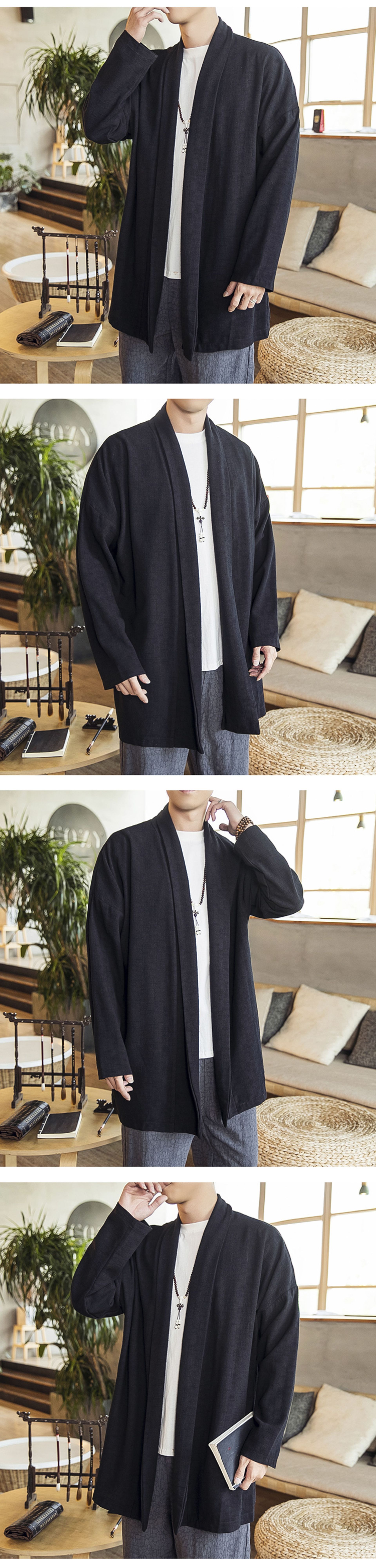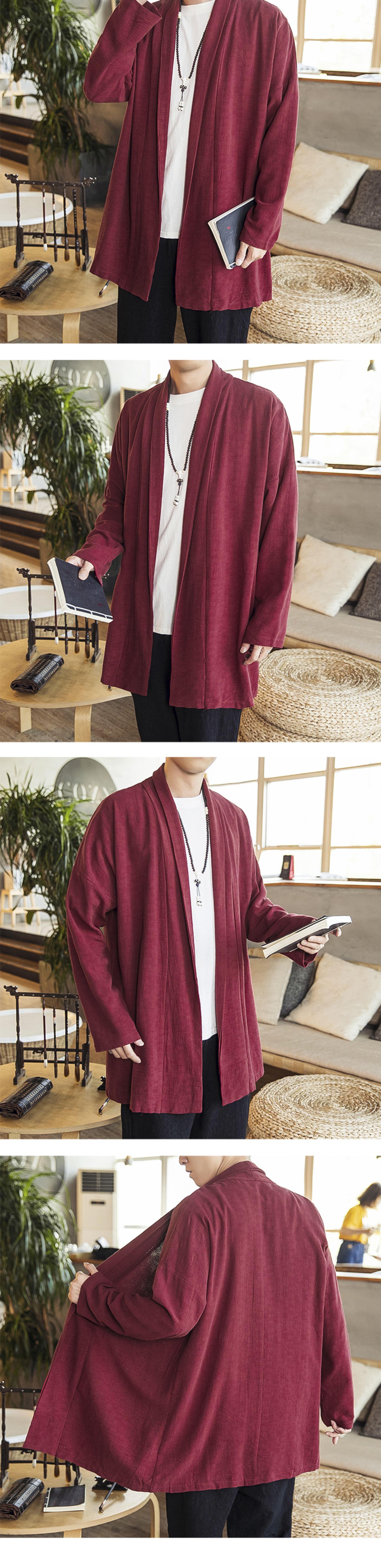 2022中国風秋モデル無ボタン風衣純色落肩袖カーディガン長袖亜麻コート漢服男装卸売り