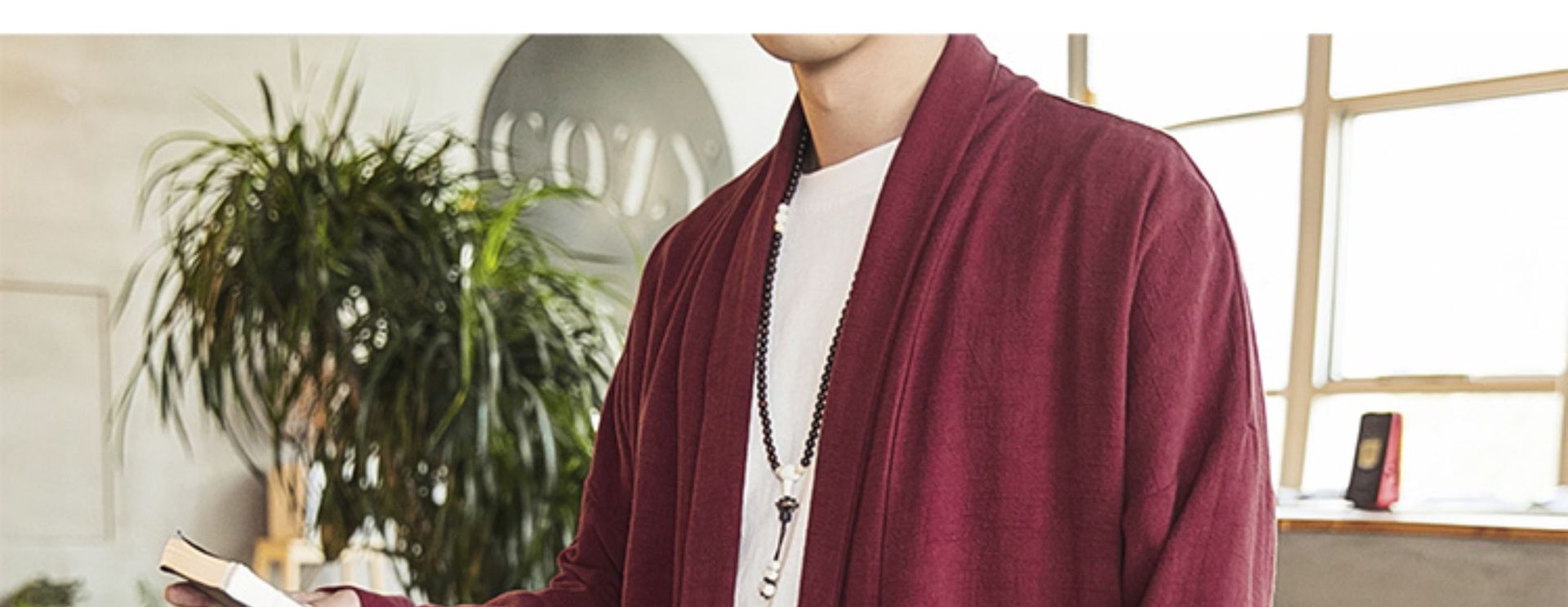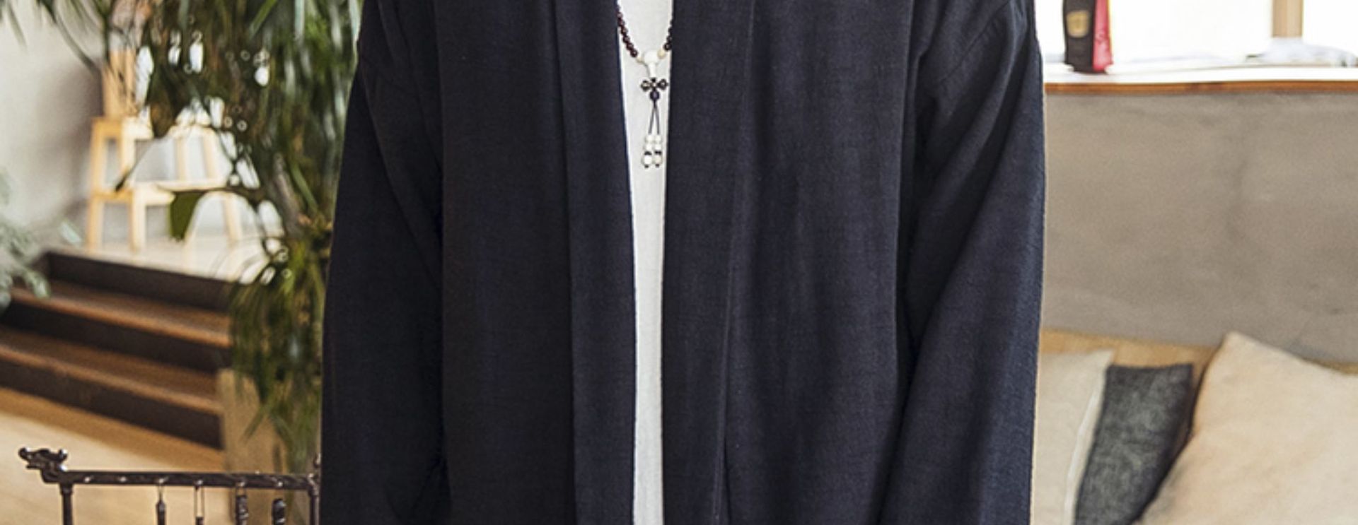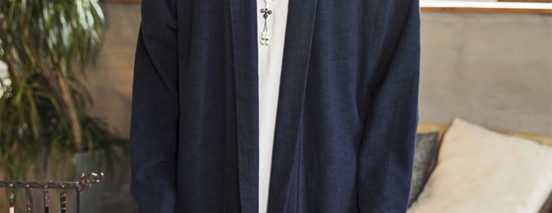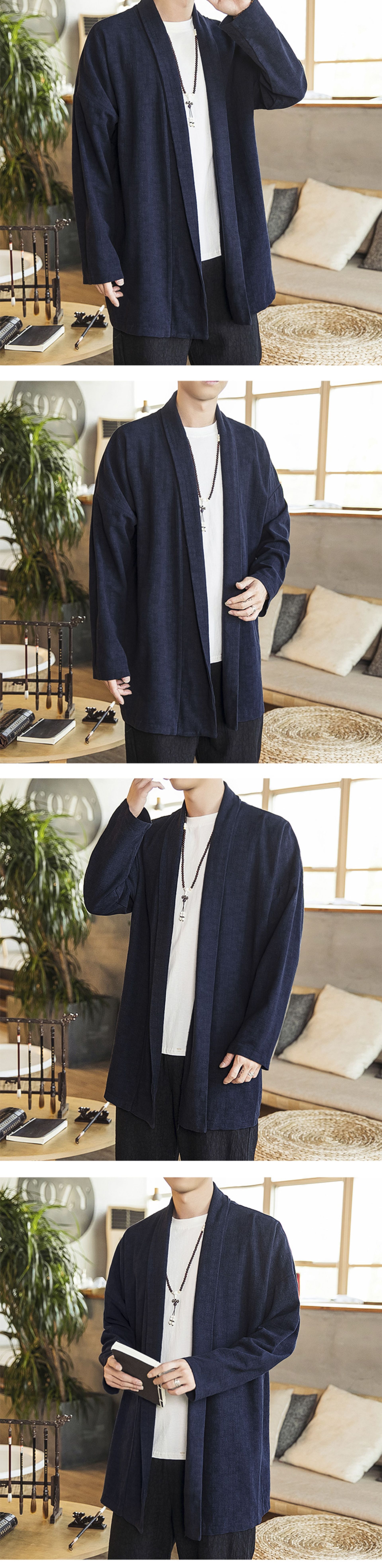 2022中国風秋モデル無ボタン風衣純色落肩袖カーディガン長袖亜麻コート漢服男装卸売り