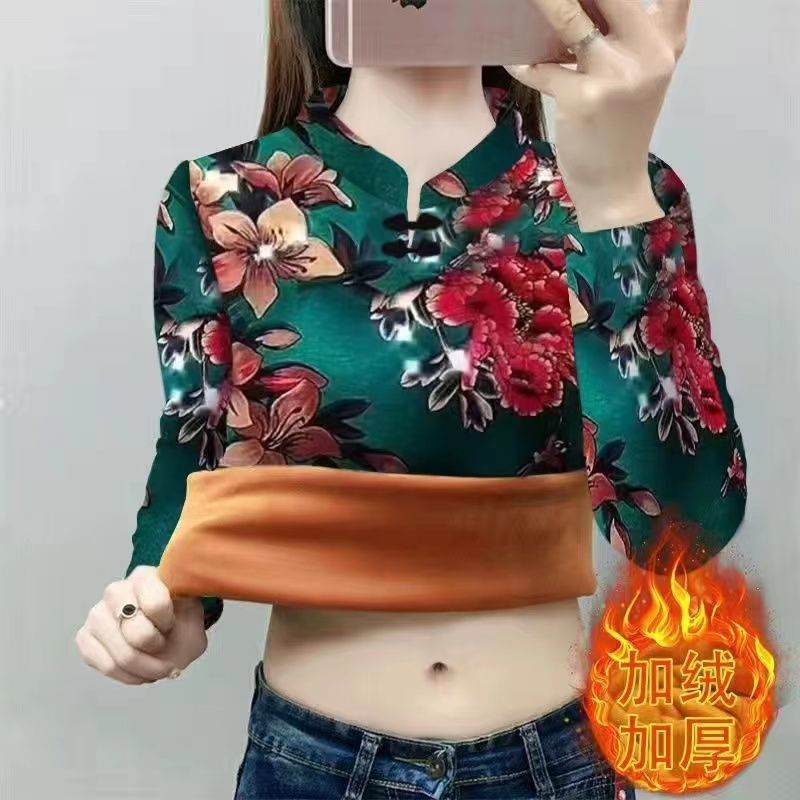 中国の老人のお母さんは秋の冬の徳の絨毯の保温の底のシャツの婦人服の新型の大きいサイズのvネックの長袖のtシャツの上で服を着ます。
