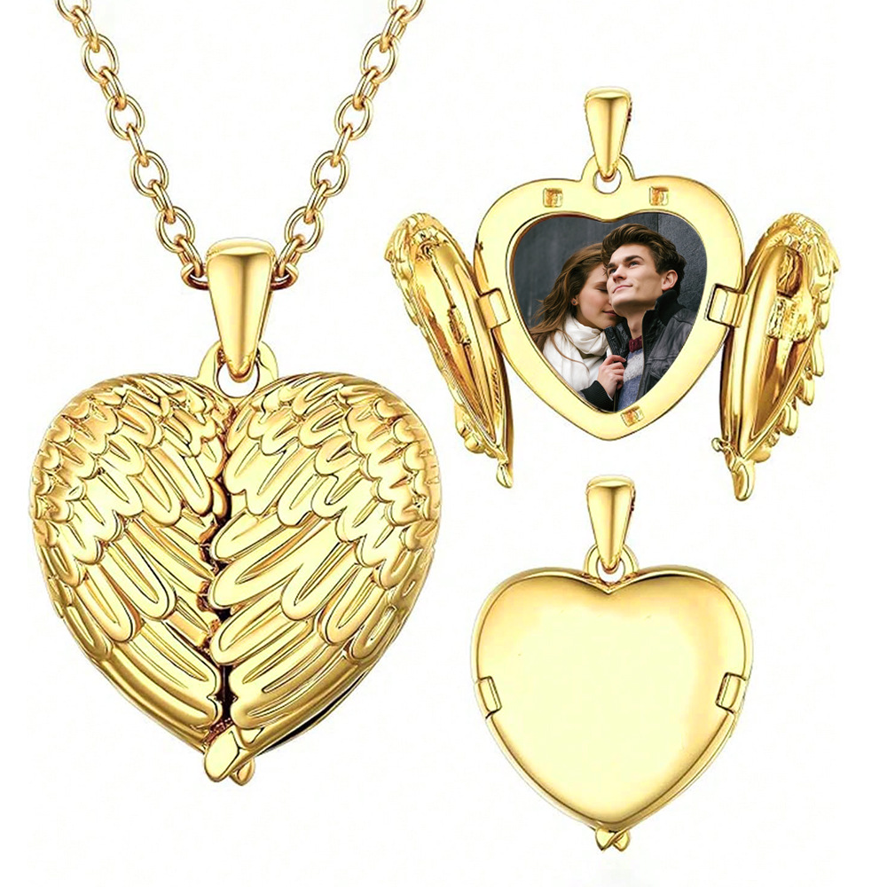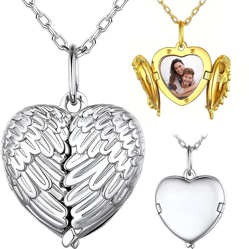 跨境欧美卖爆金属爱心项链亮面可放相片开合翅膀相盒项链吊坠桃心