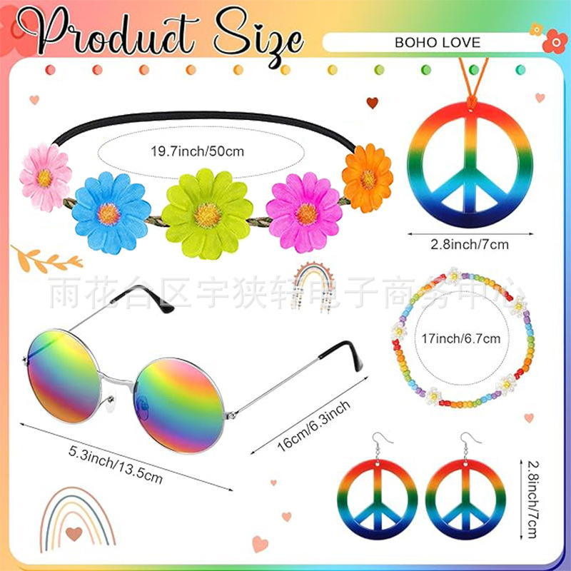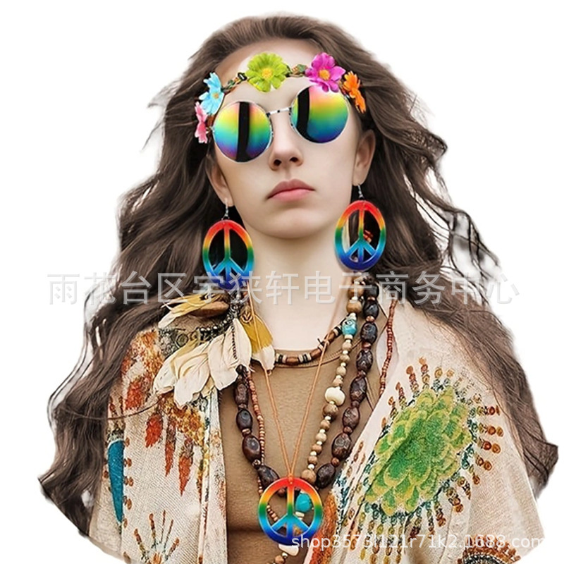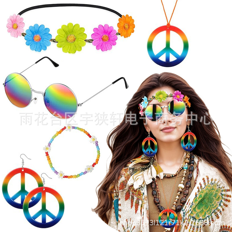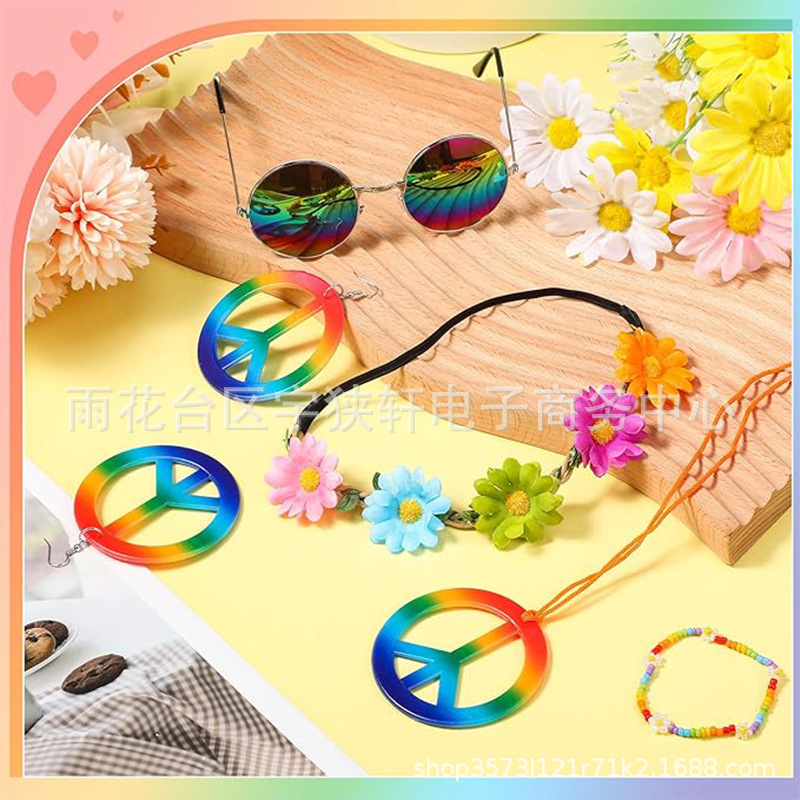万圣节狂欢节嬉皮士和平标志项链头带耳环手链太阳眼镜五件套