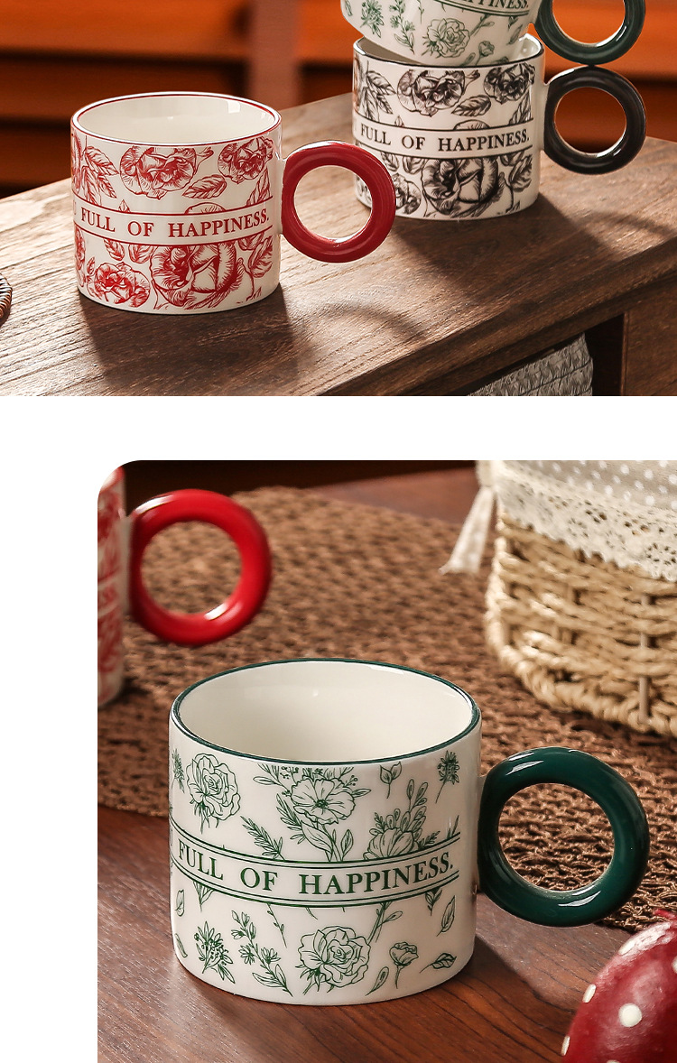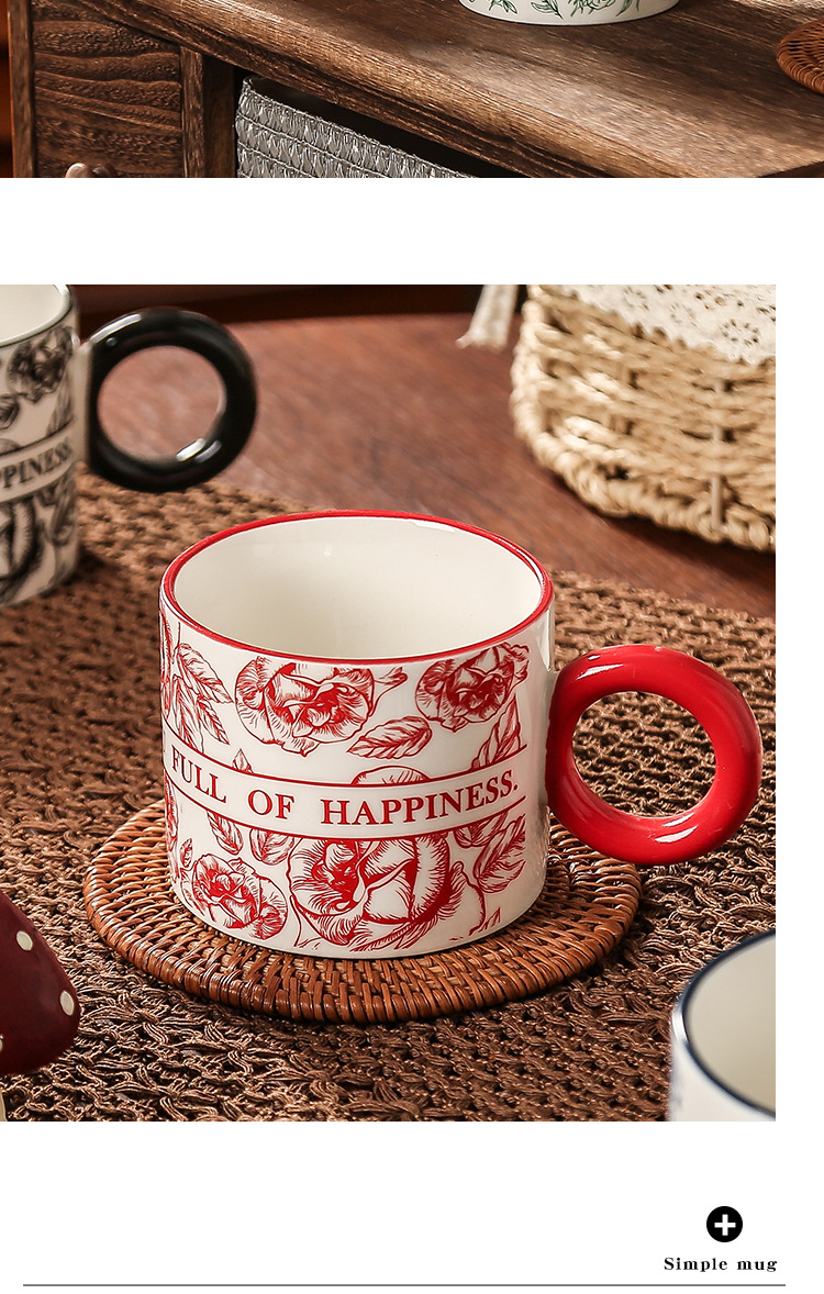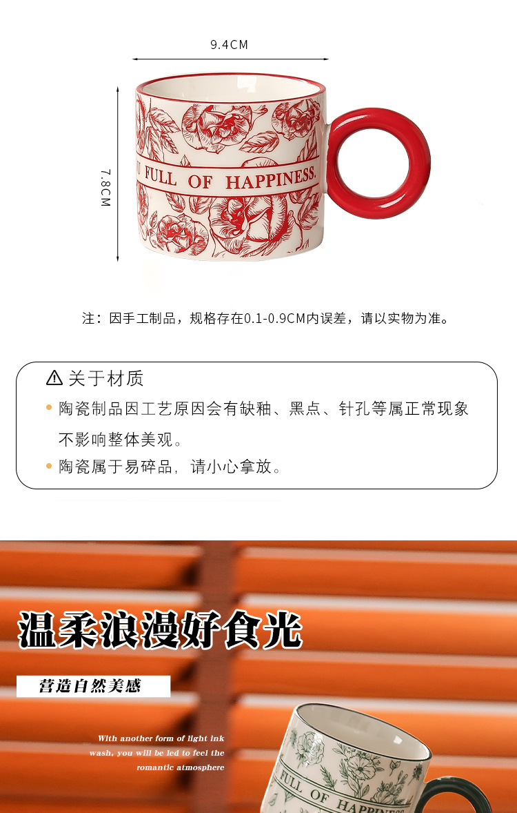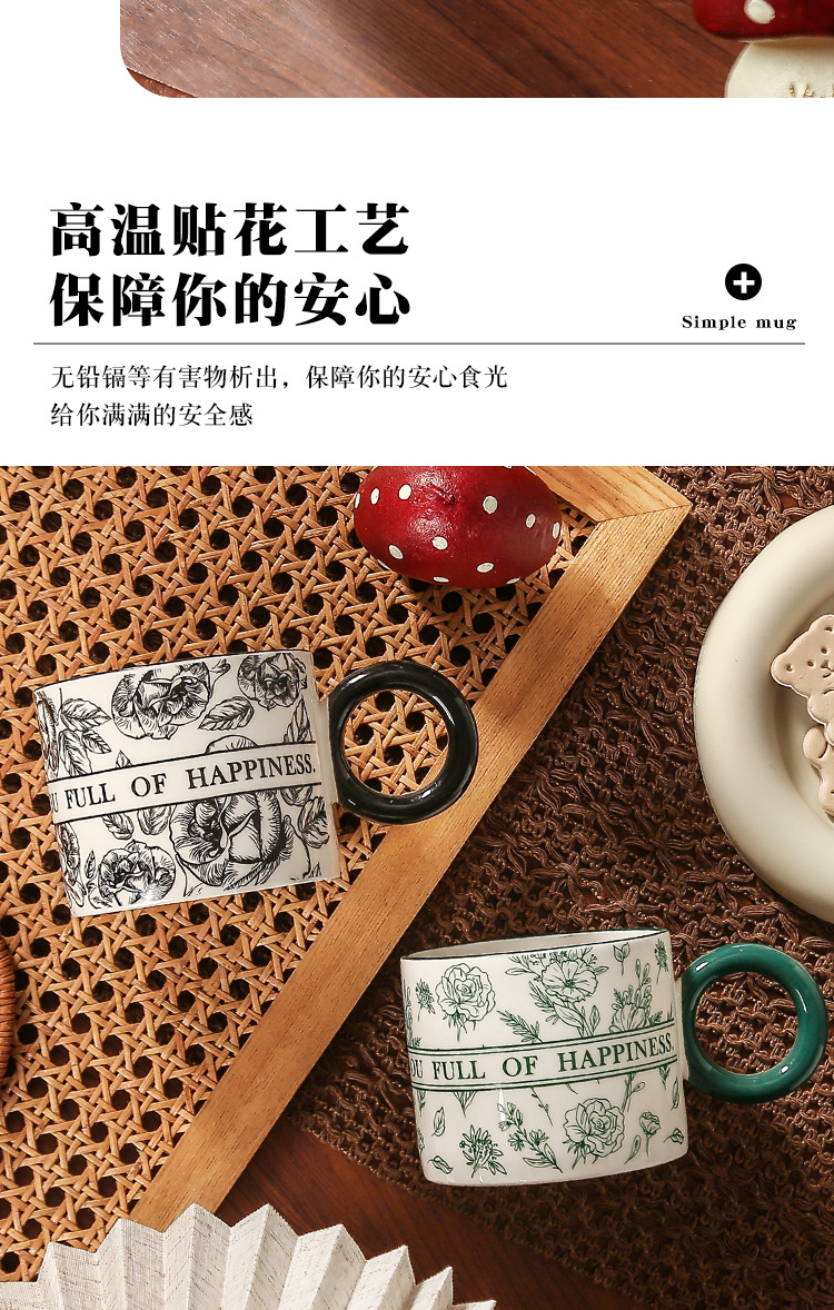 日式复古陶瓷杯创意图案咖啡杯拿铁拉花杯家用燕麦杯粗陶花边杯子