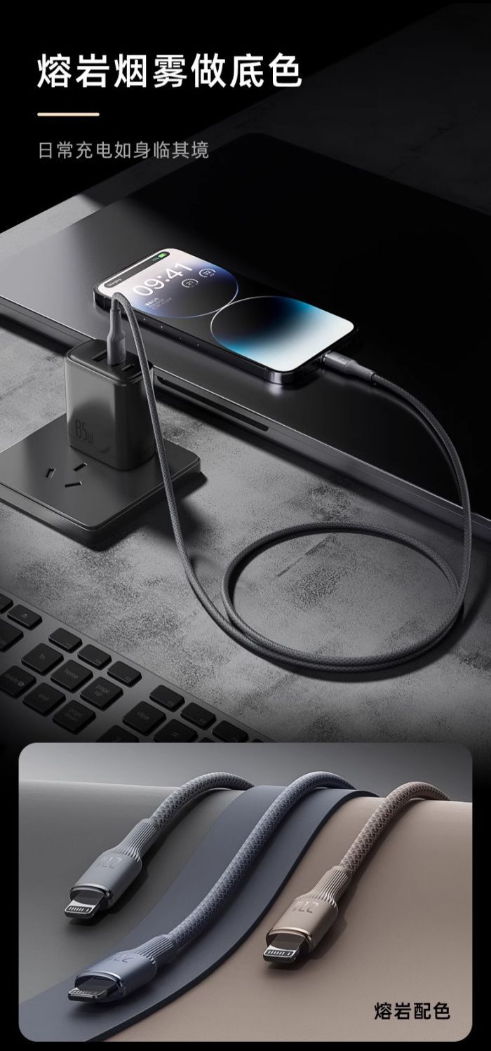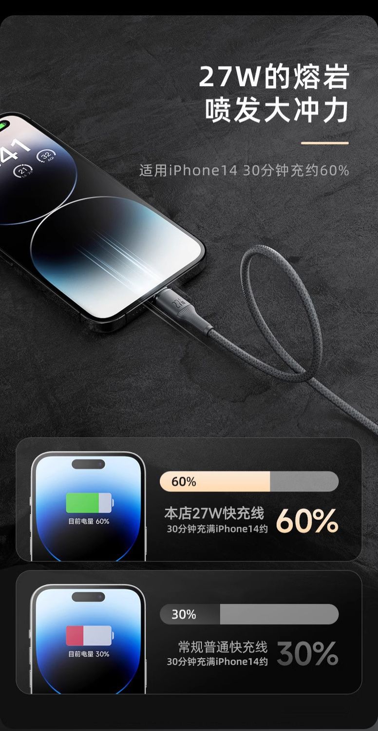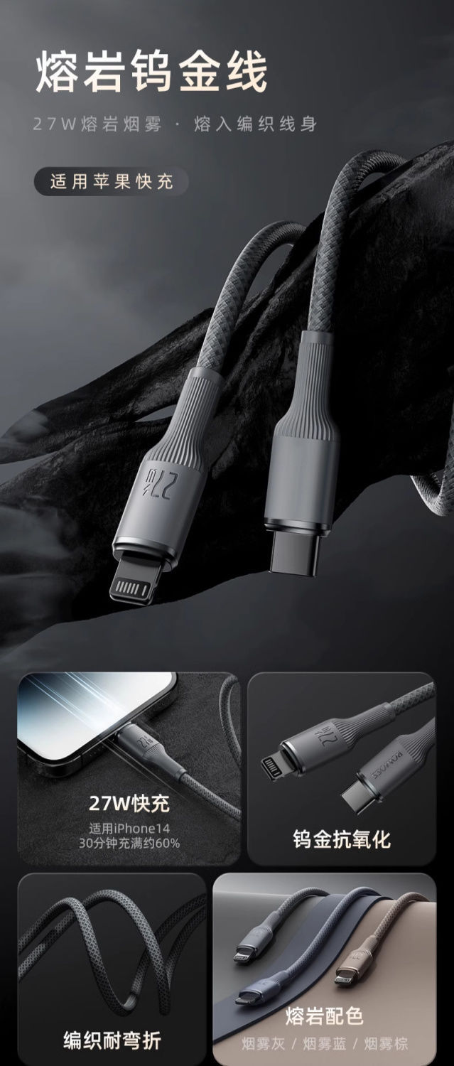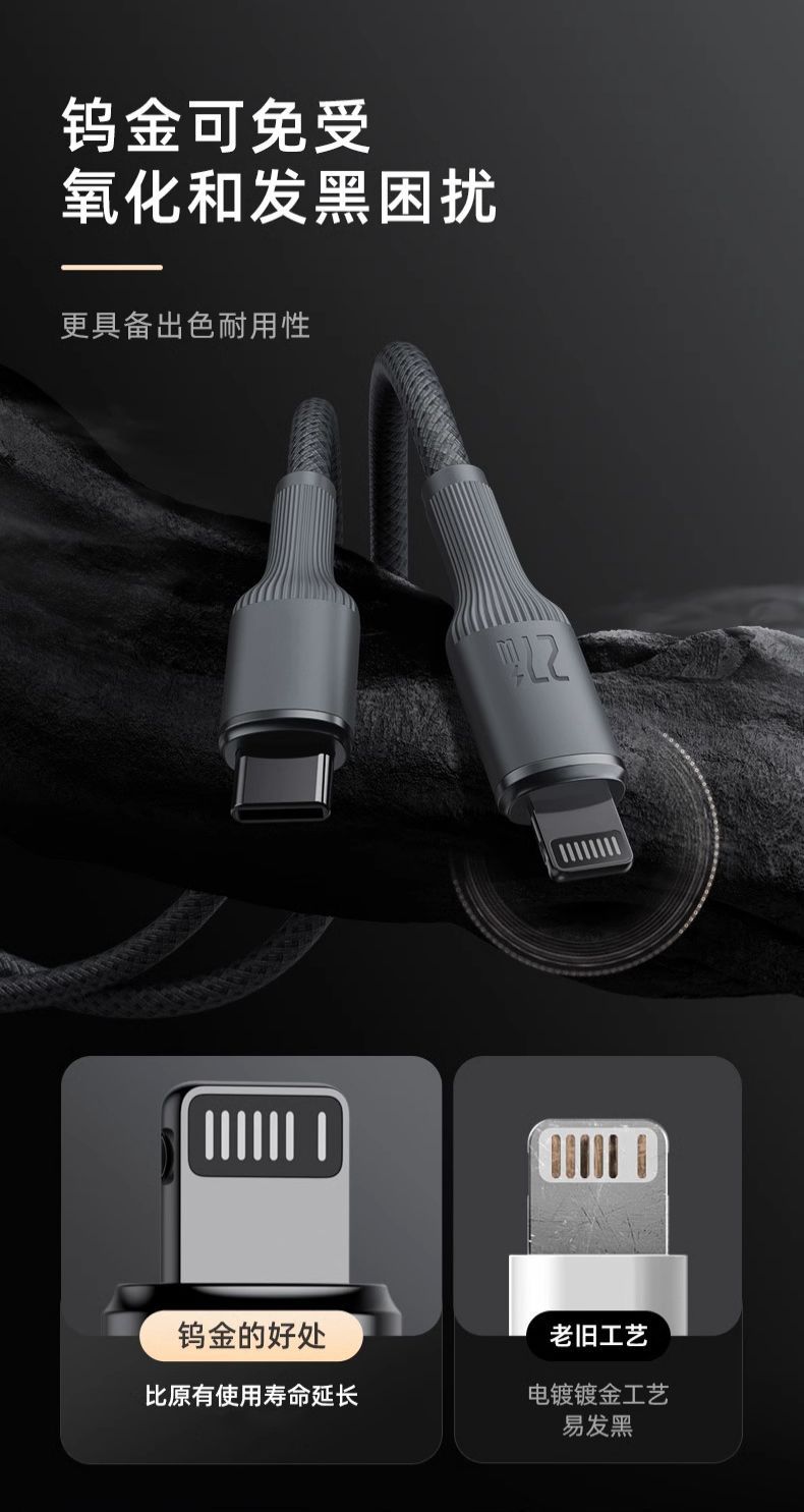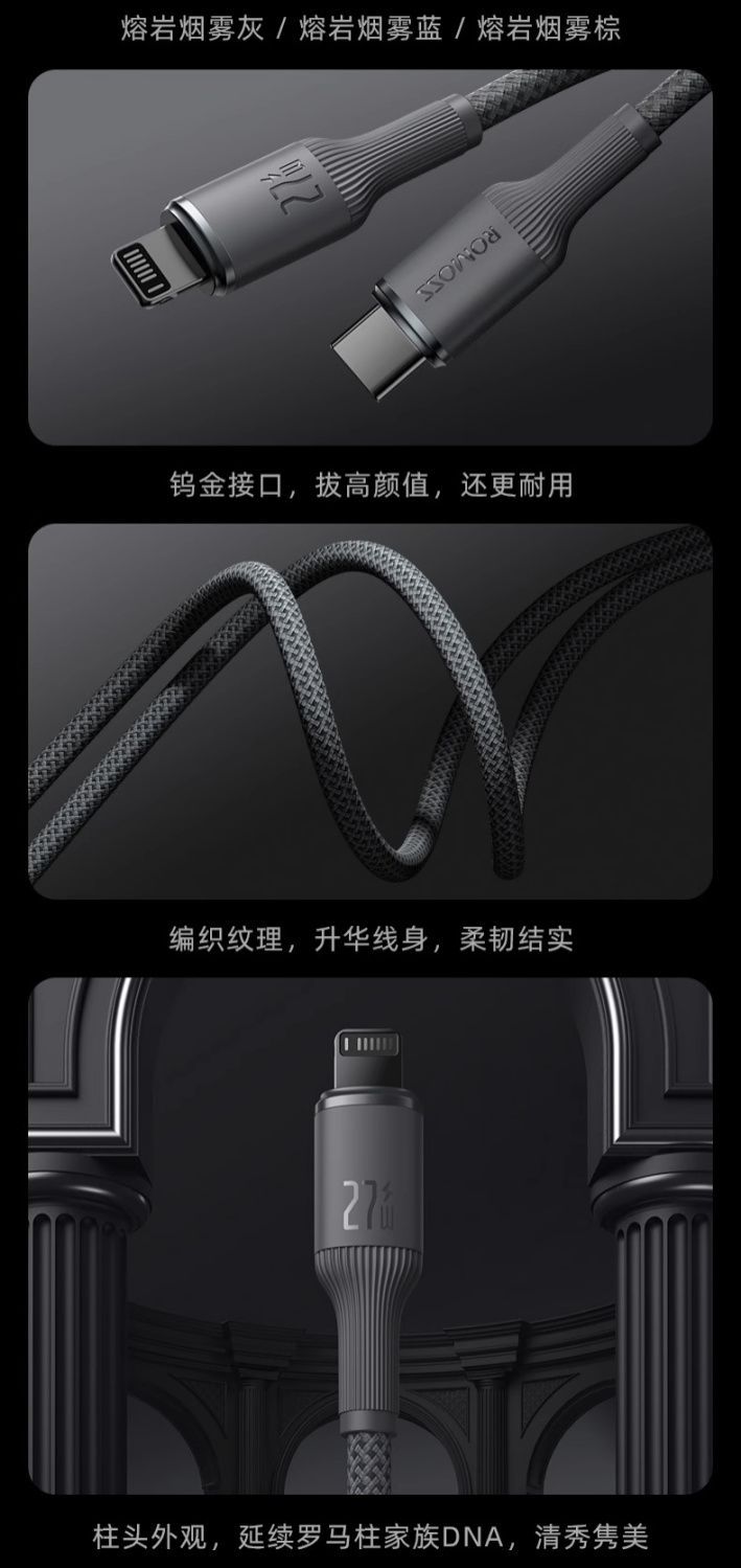 爆款罗马仕钨金100W快充数据线PD27W适用苹果华为车载typec充电线