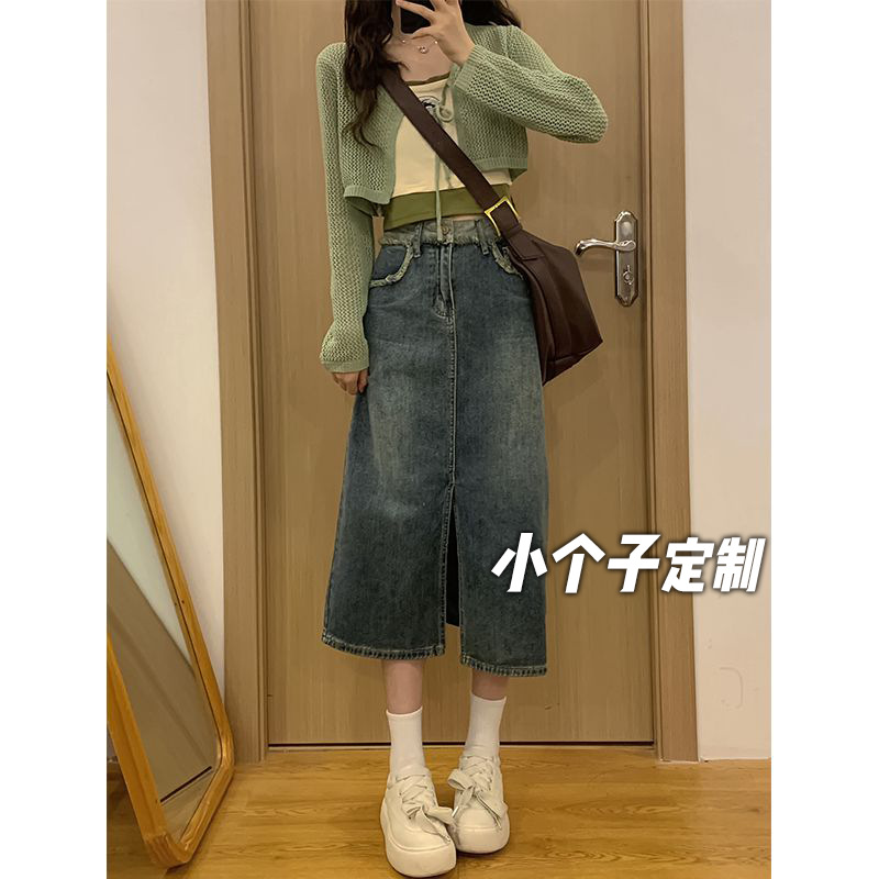 ハイウエストのオープンデニムスカートa字の中長のスカートの女性の夏のネットの赤い薄いタイプの小さい背はやせていてヒップのスカートを包みます。