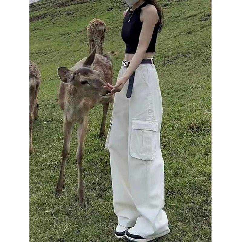 黒灰色のワイドジーンズの女性のダブルボタンのウエストがゆったりしていて、痩せています。
