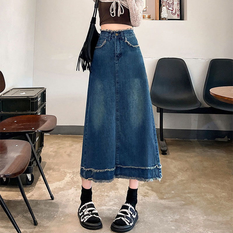 タッセルローエッジデニムスカート、ハイエンドレディース2025年新作ミドル丈スカート、カバークロス、痩身、ハイウエスト