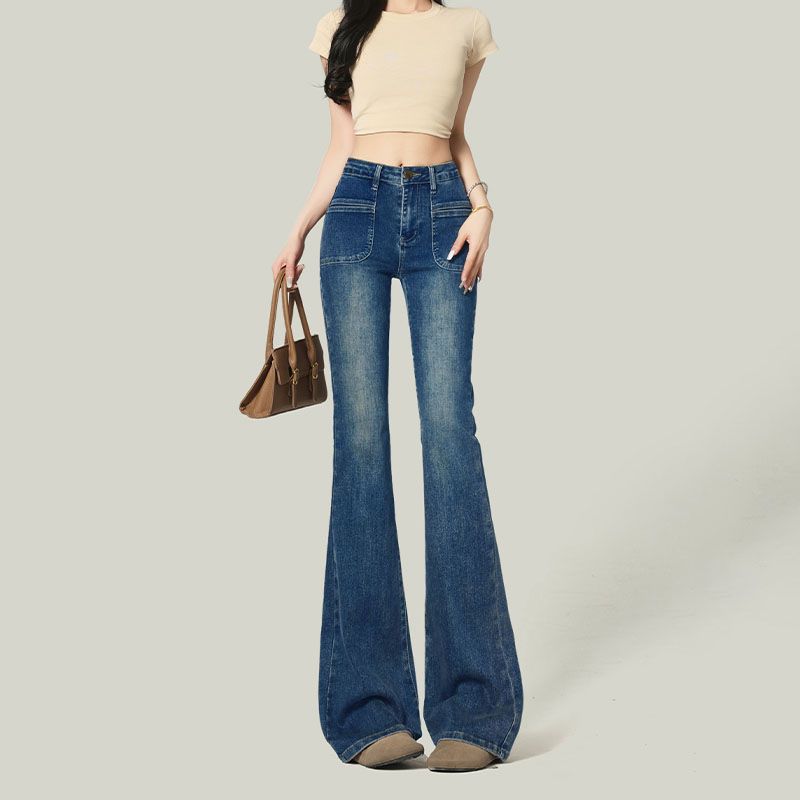 婦人服2025年レトロブルーラッパズボンが高くて背が高いです。