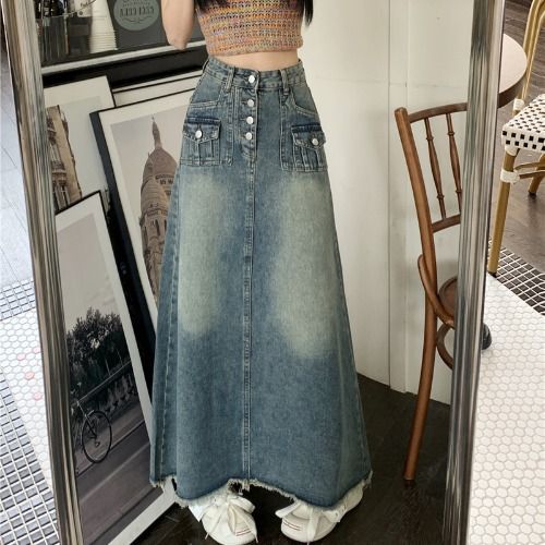 春の婦人服の中の長いスカートは腰が高くてやせているa字のスカートの2023春の服装の新型のデニムのフォークの半身のスカートを現します。