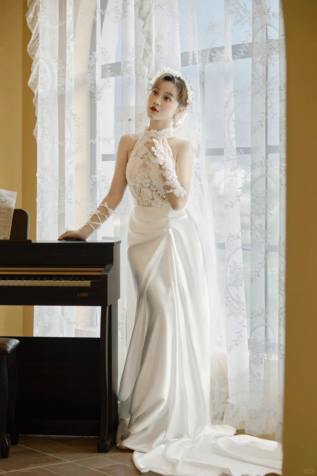 花嫁のウェディングドレスの手袋は腕の花を遮ります。