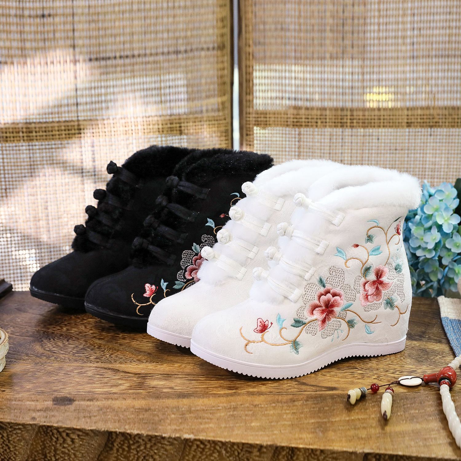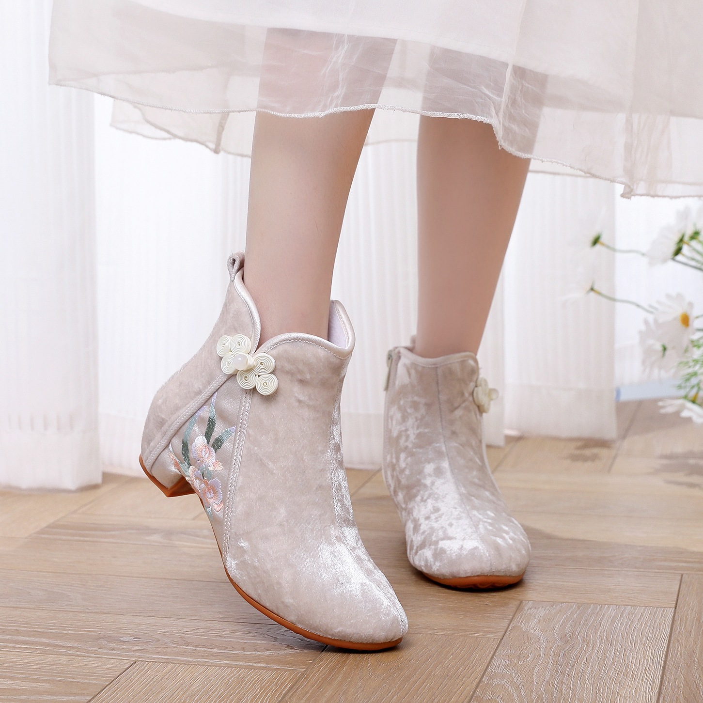 【初蝶】2025年新款冬季加绒复古绣花妈妈民族风绒面配旗袍短靴女