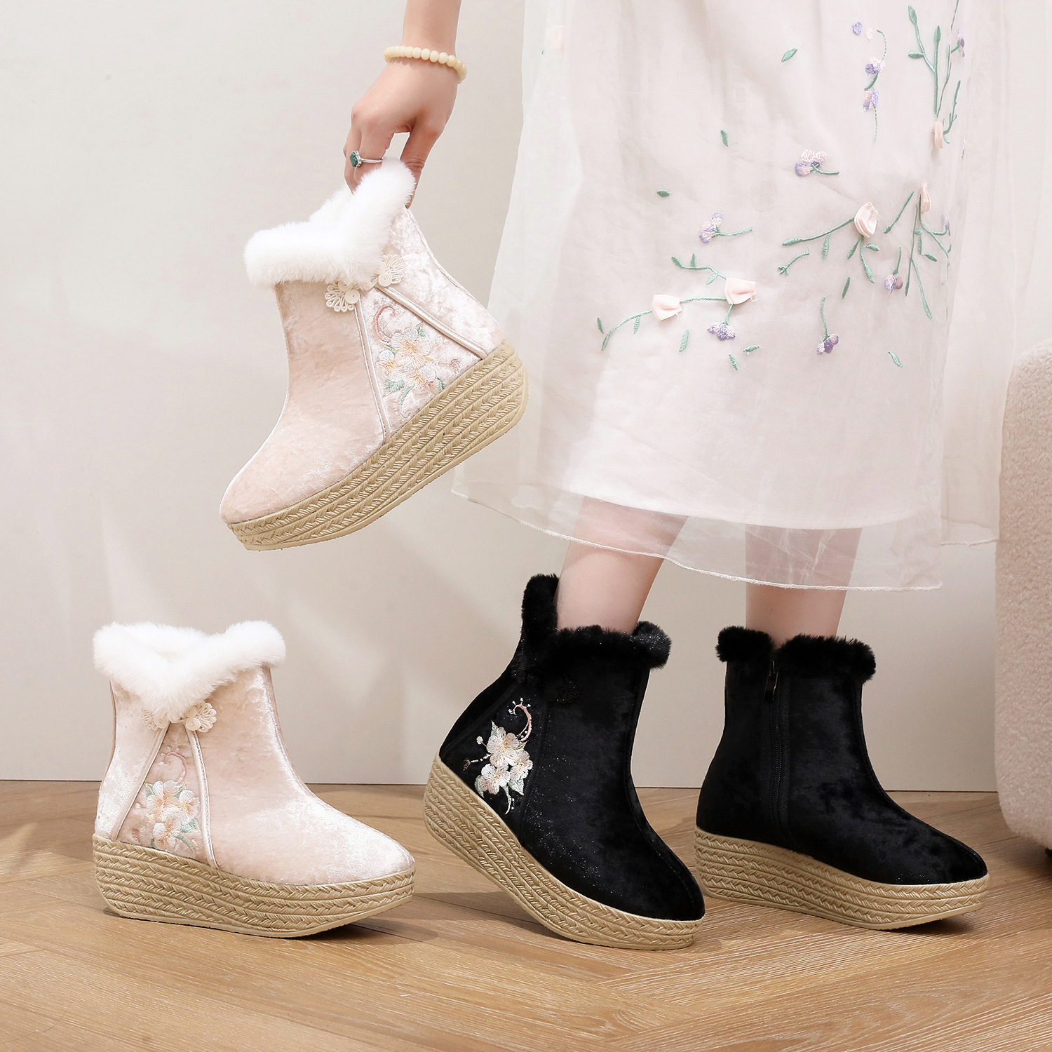 米兰 2025年冬季新款低跟搭配旗袍汉服鞋民族风棉鞋毛口绣花鞋