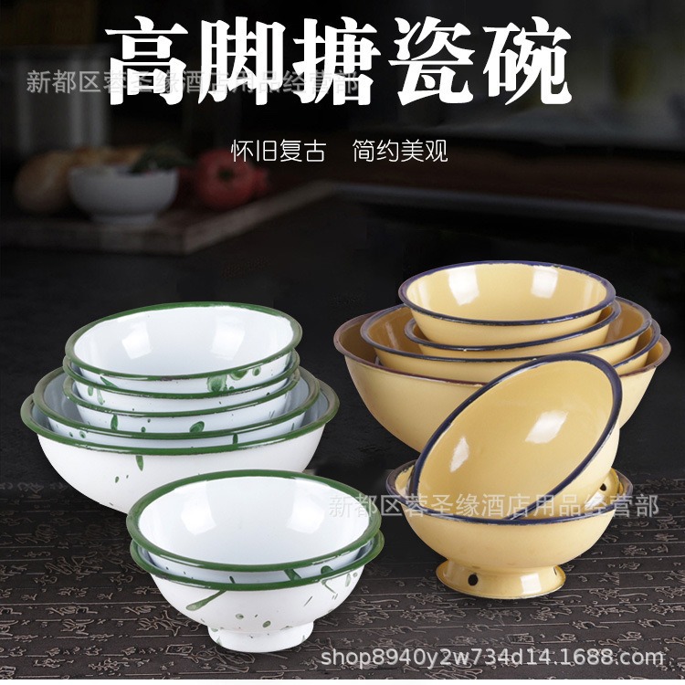 加厚搪瓷碗怀旧老式洋瓷高脚碗儿童面碗蒸饭碗珐琅米饭碗家用饭碗