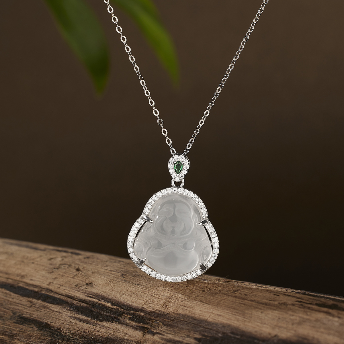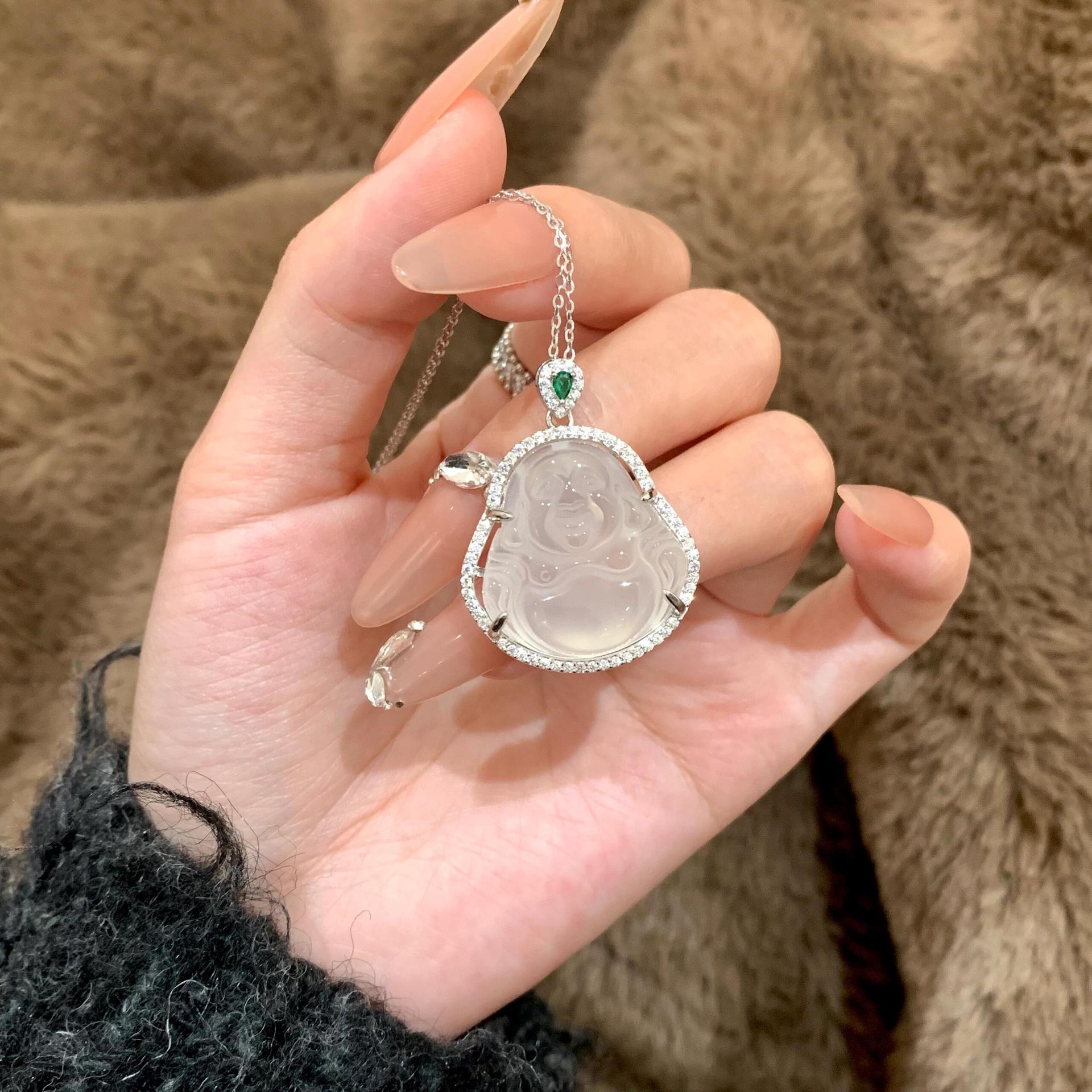 S925銀モザイク天然高氷玉髄仏公ペンダントネックレス弥勒仏笑仏新中国式首鎖大腹仏