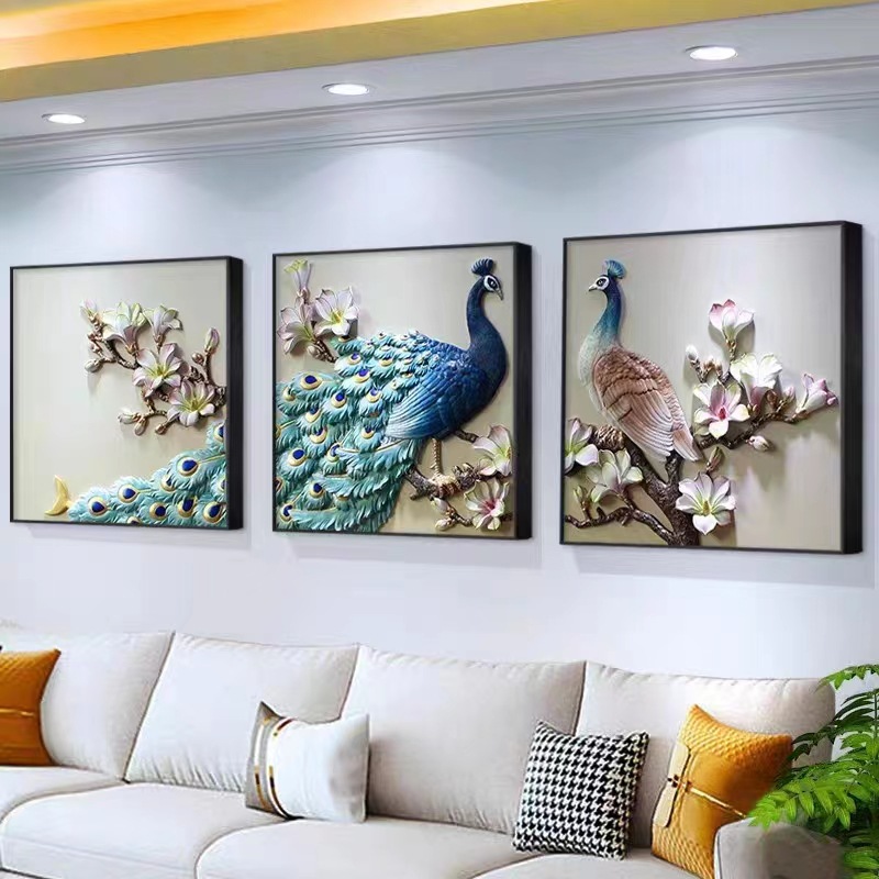 新しい北欧の家庭の客間の装飾画のソファーの背景の壁は3連の立体のレリーフの孔雀の壁画を描きます。