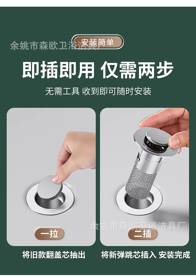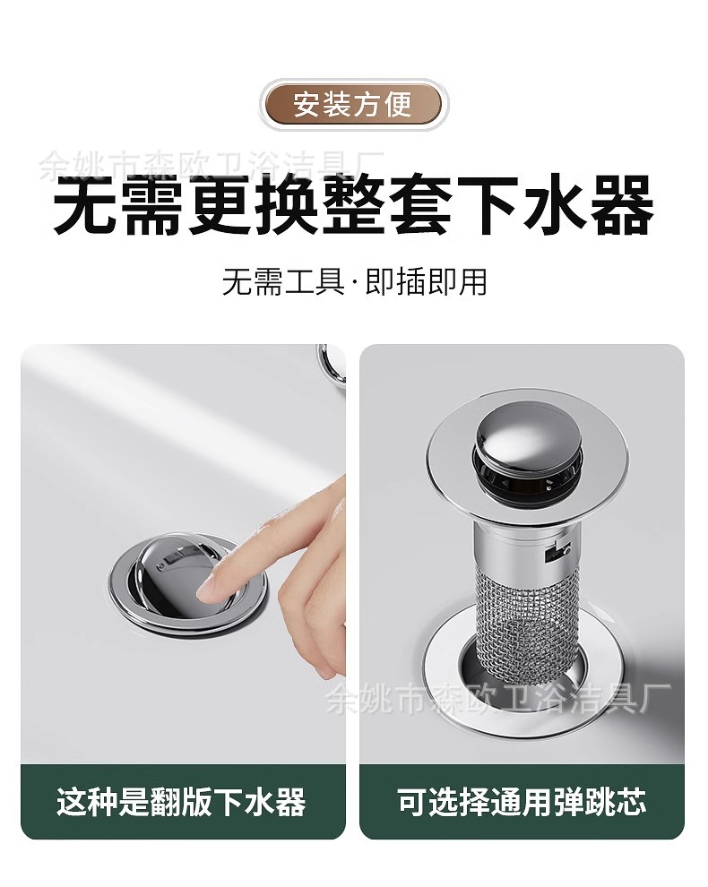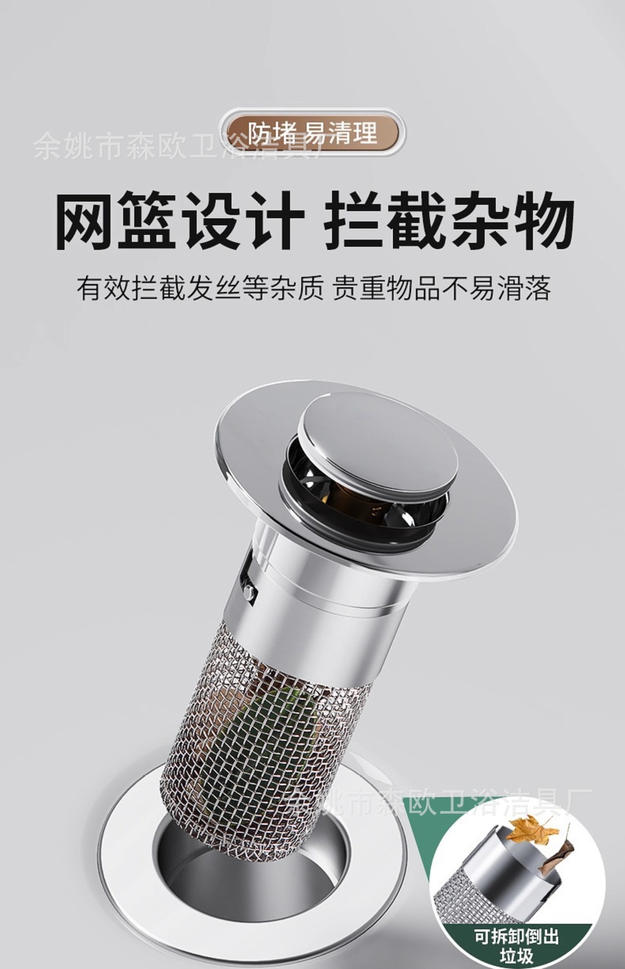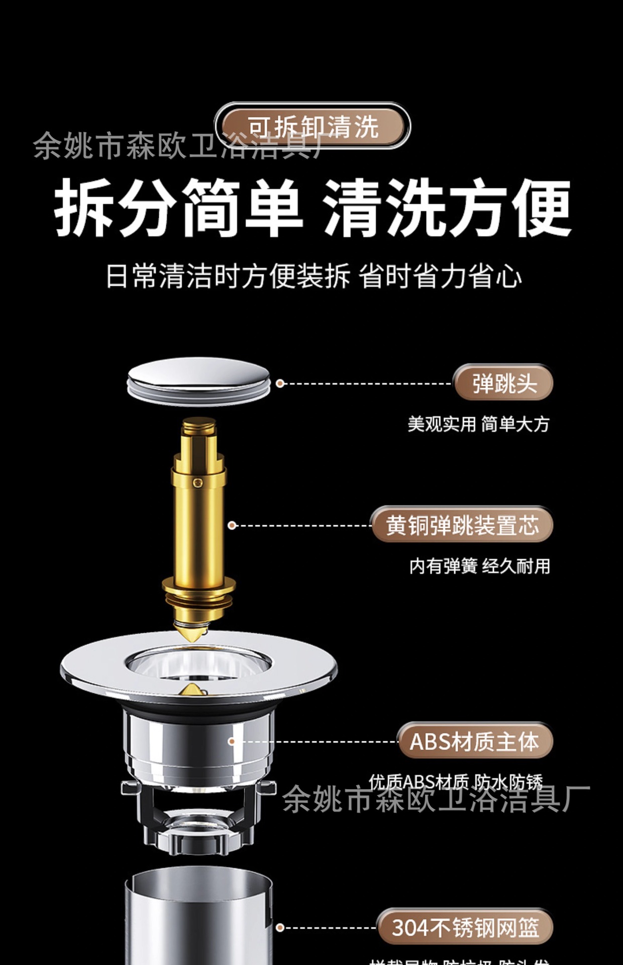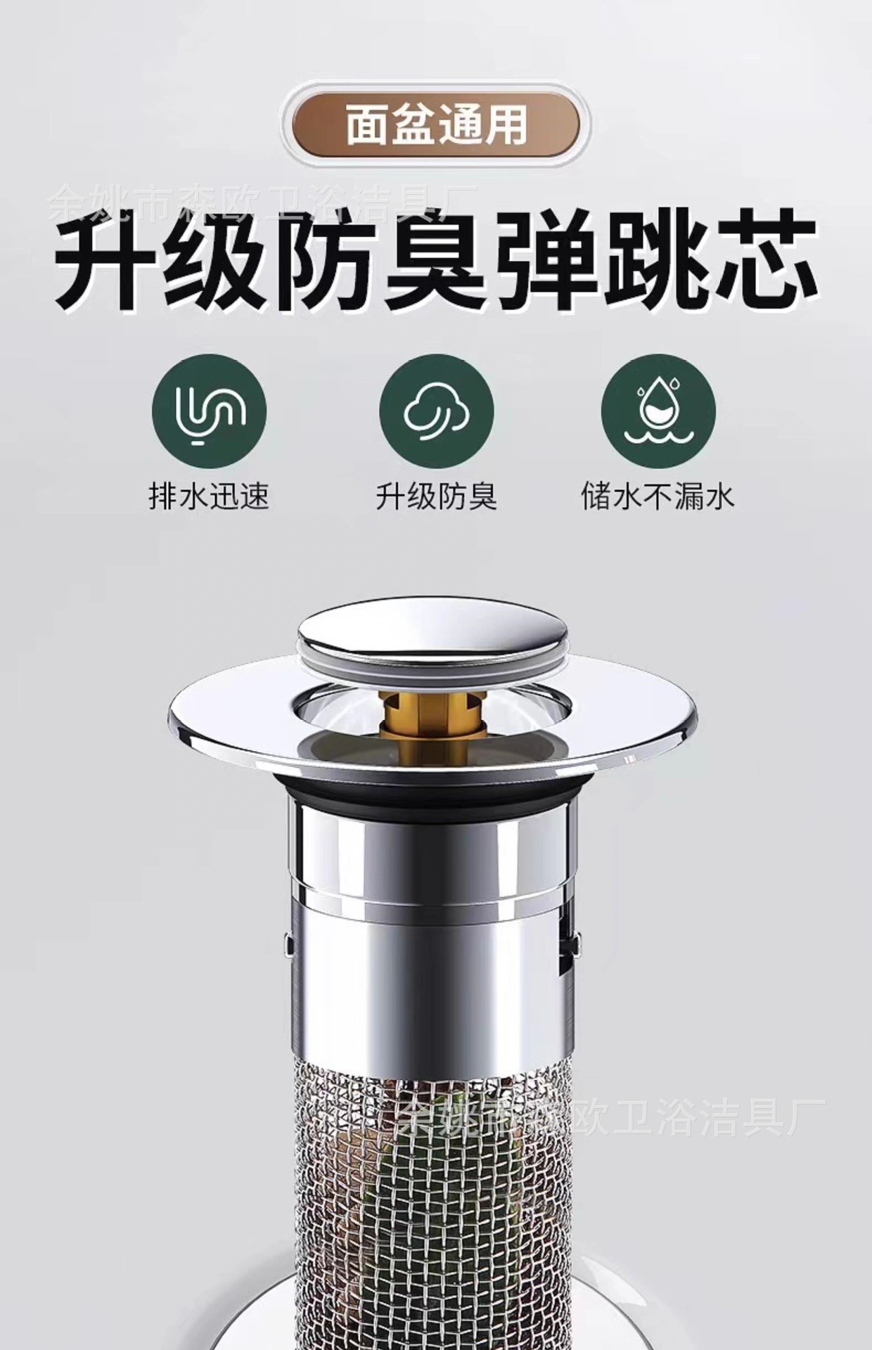 面盆洗手盆通用弹跳芯304不锈钢防臭堵孔塞洗脸盆按压式下水器过