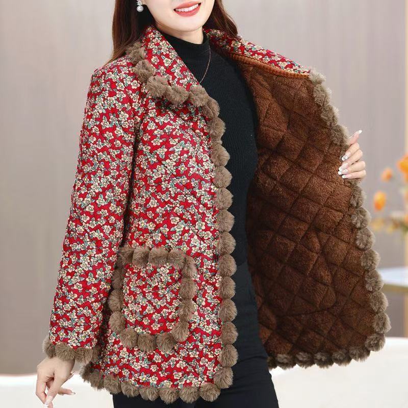 A中高年女装冬服綿入れのお母さんは冬に厚いベルベットの保温コートを着て、老人のプリントの大きいサイズの綿入れを着ます