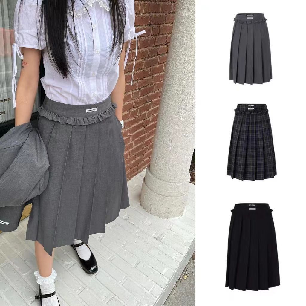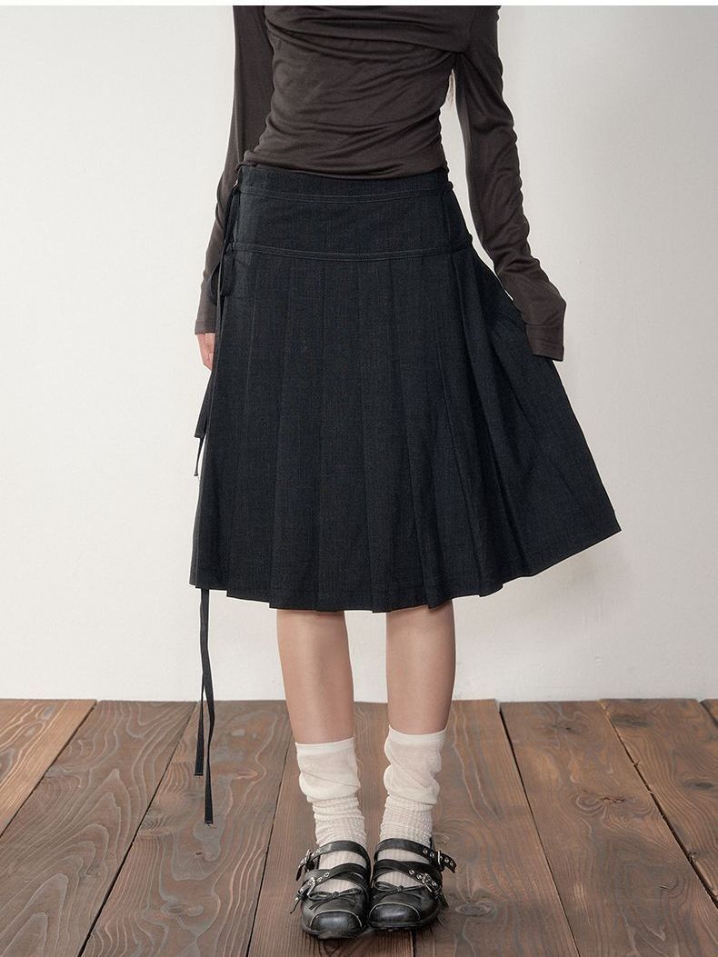 原创韩系深灰色学院风系带中长裙修身百褶半身裙子