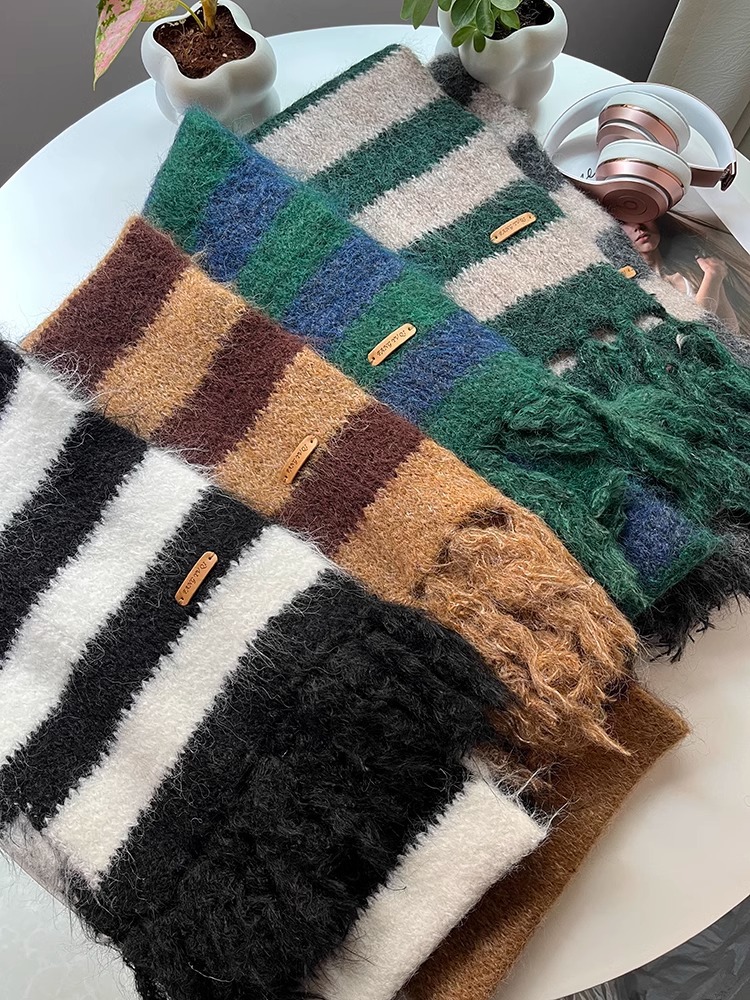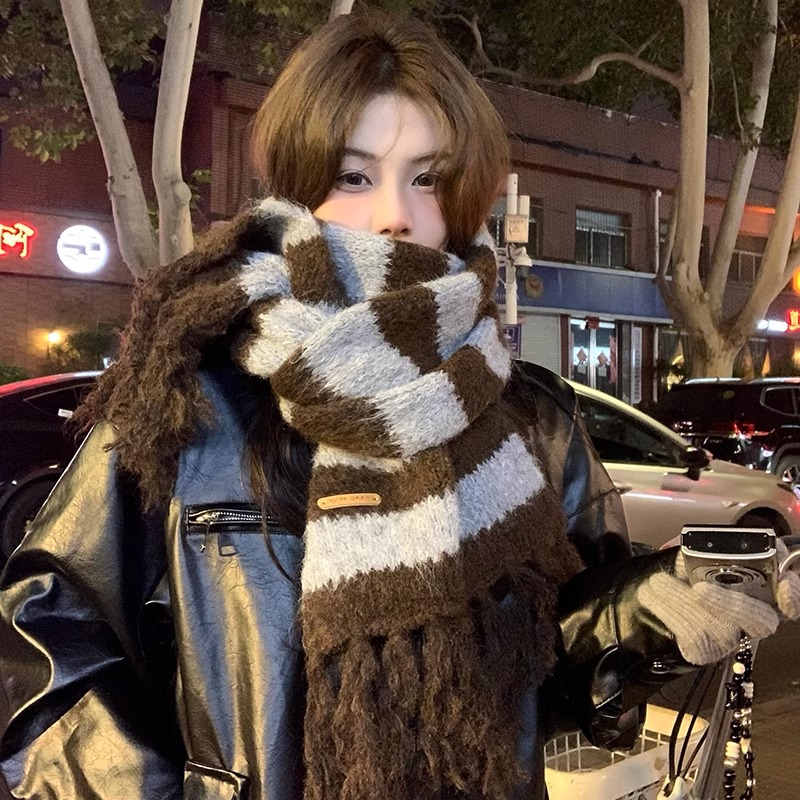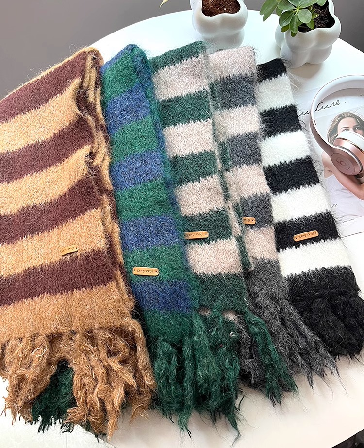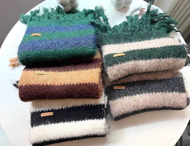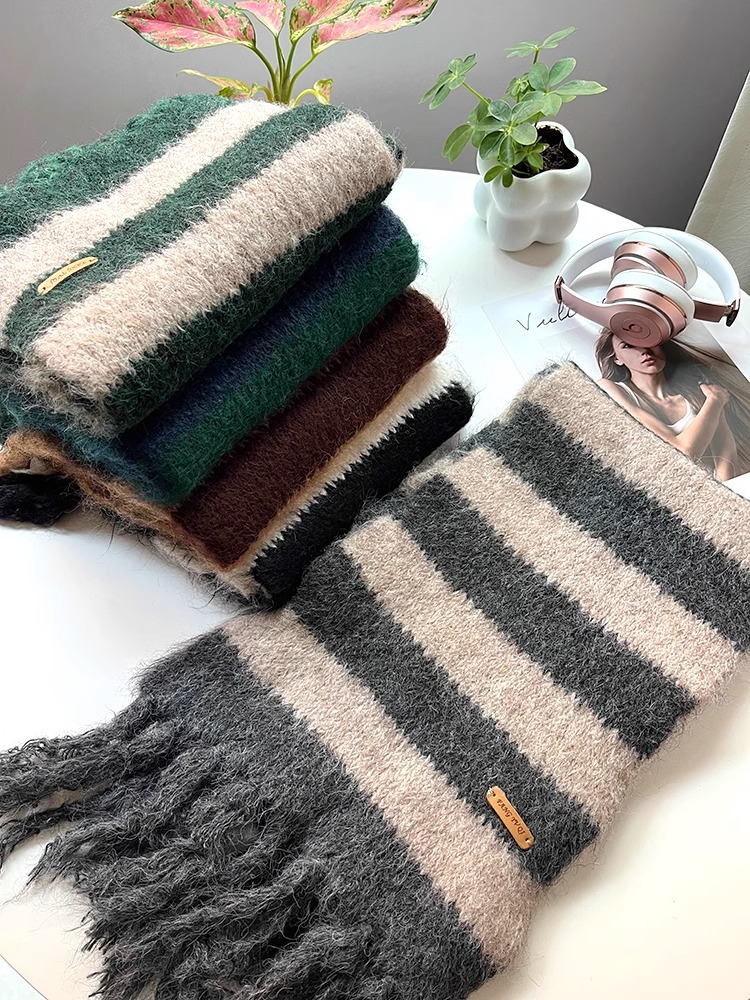 秋冬氛围感~新款韩系羊毛混纺流苏条纹针织围巾女保暖围脖百搭潮