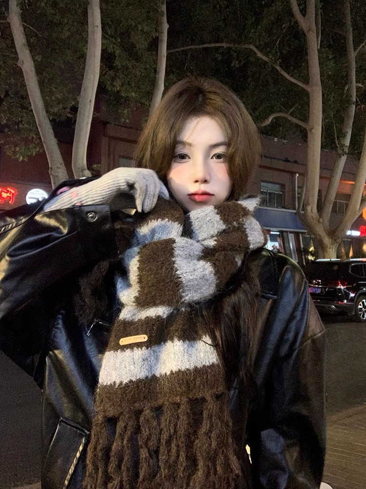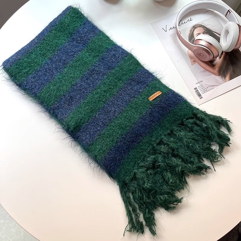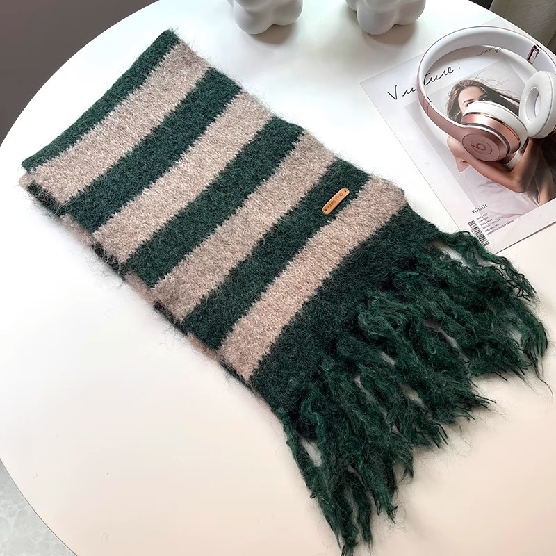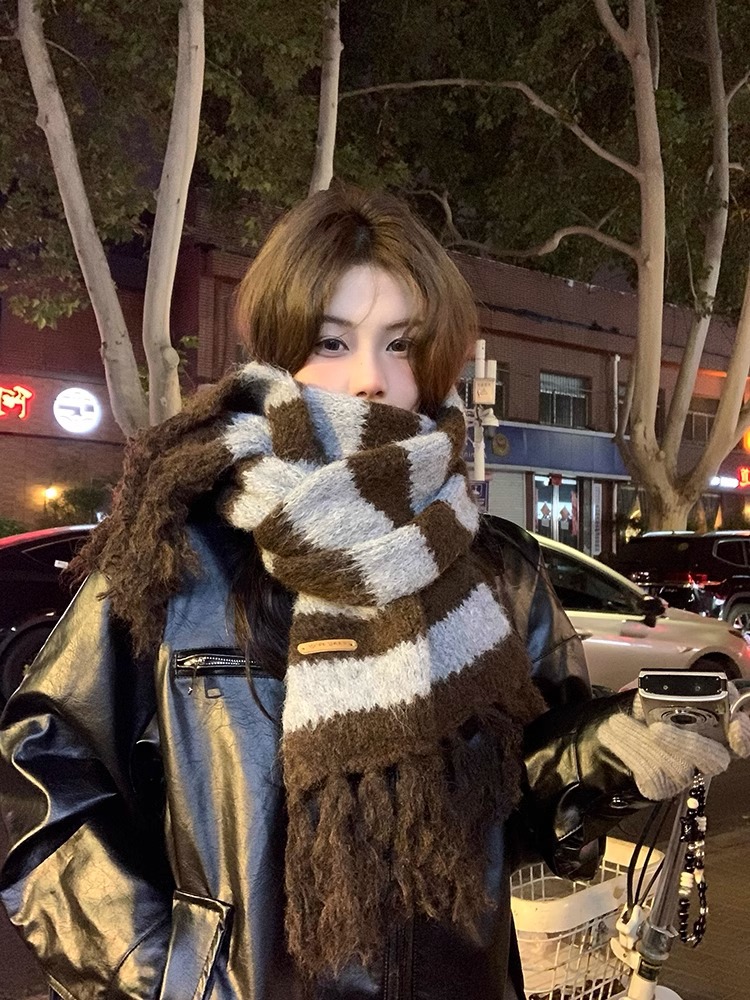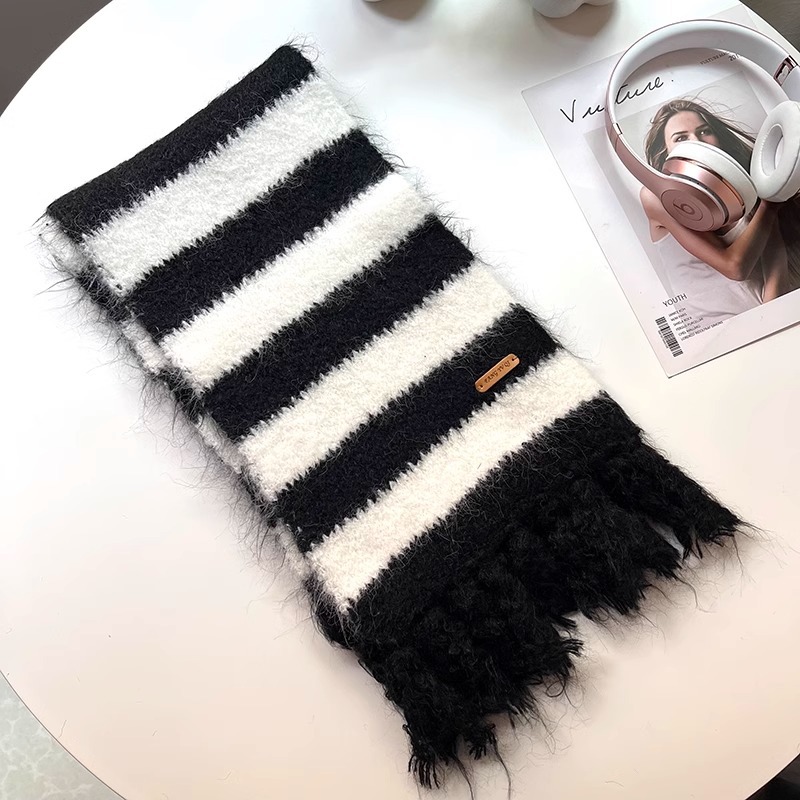 秋冬氛围感~新款韩系羊毛混纺流苏条纹针织围巾女保暖围脖百搭潮
