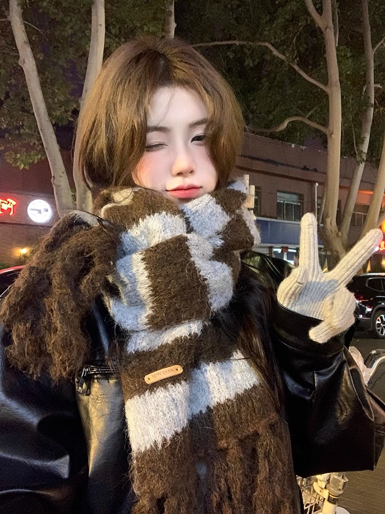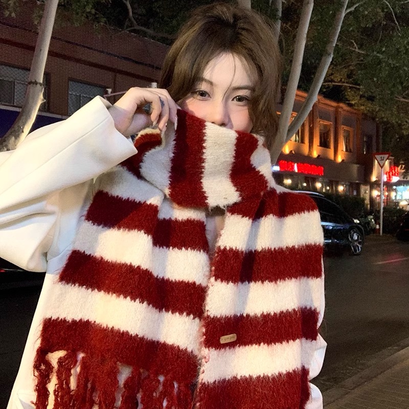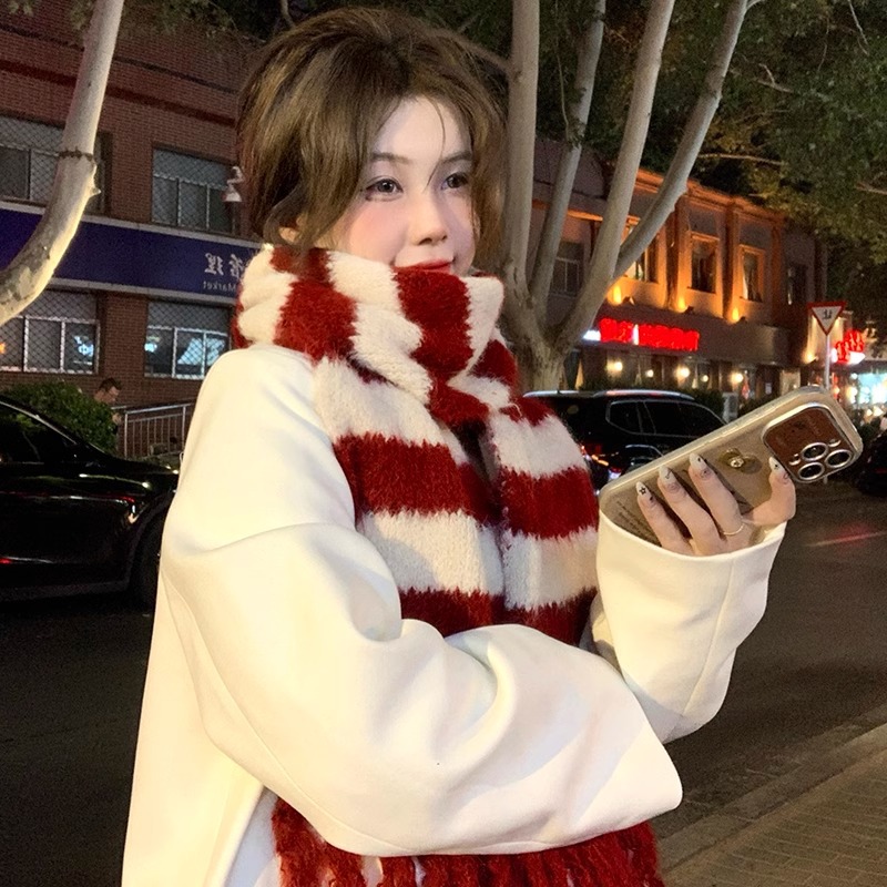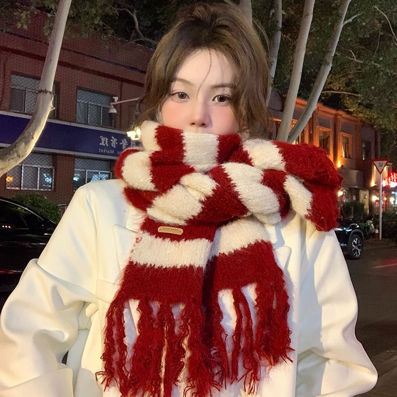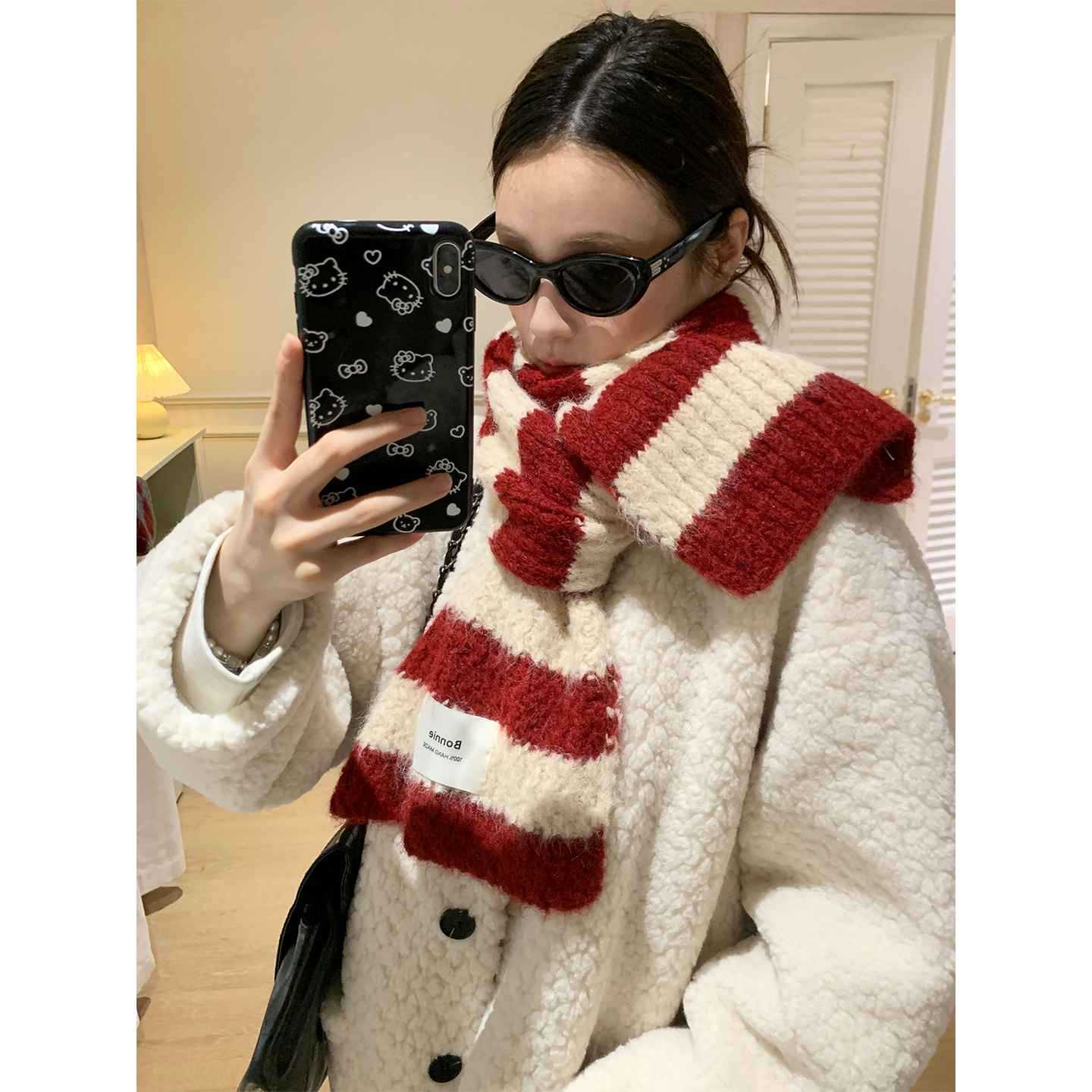 含羊毛撞色红白条纹针织围巾女秋冬韩系复古加厚街头百搭保暖围脖