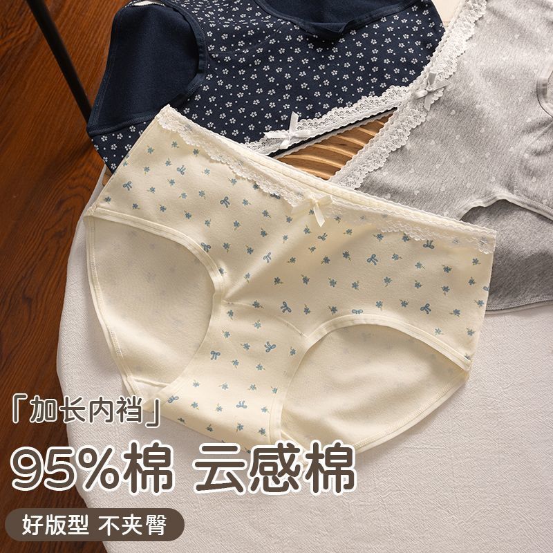 纯棉内裤女小清新甜美可爱蝴蝶结碎花少女生加长裆蕾丝边三角裤衩