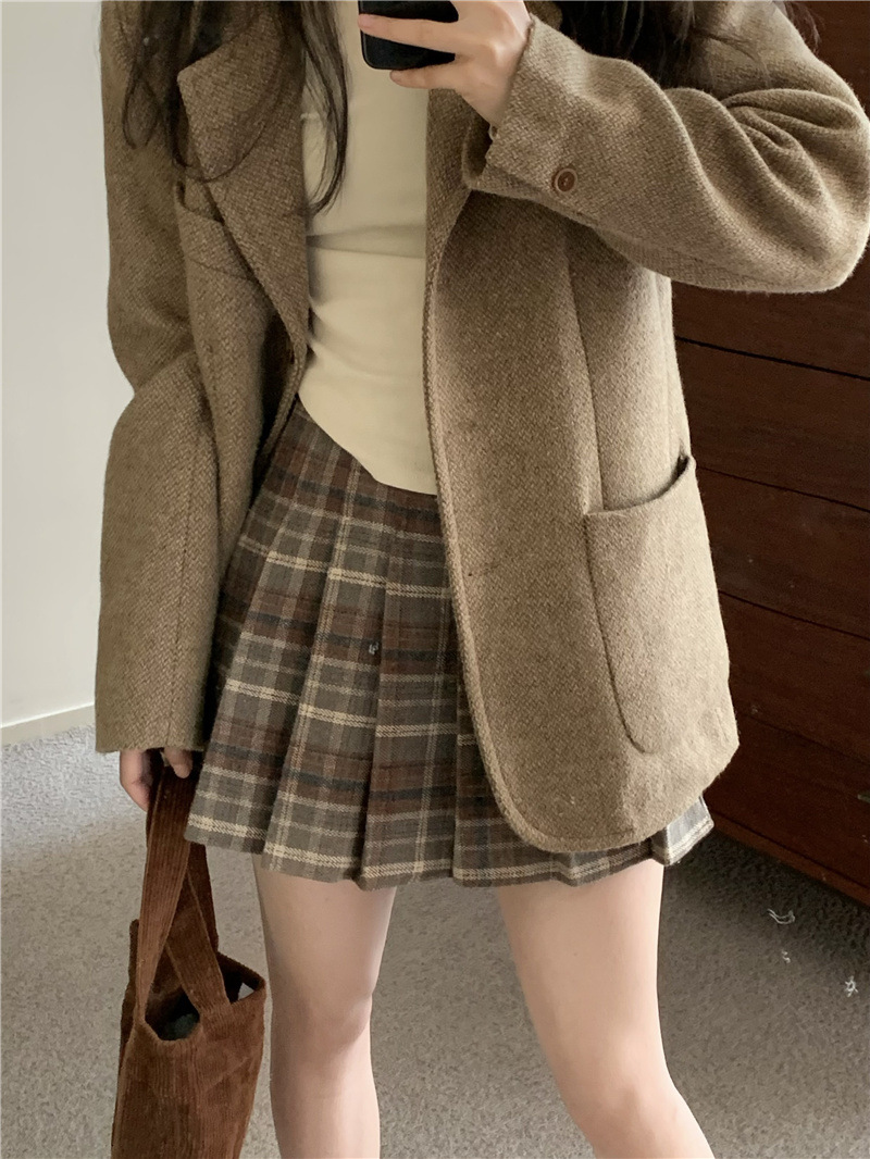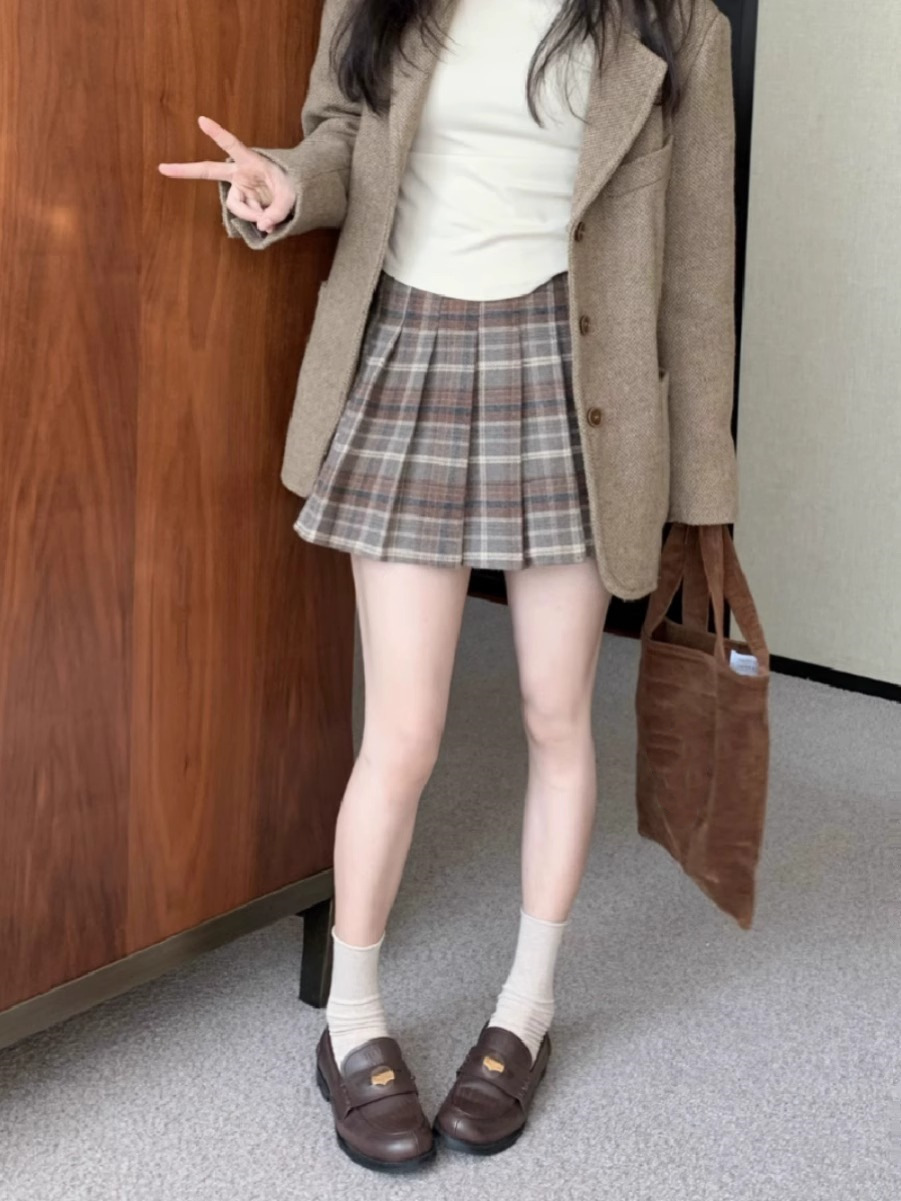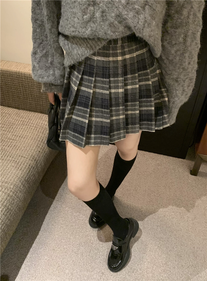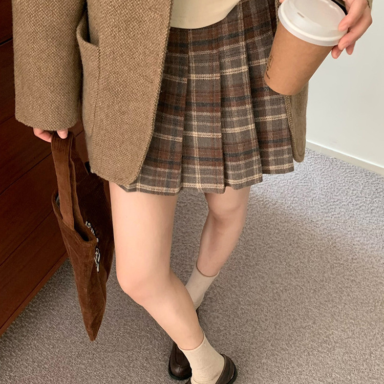 秋冬の女性用レトロチェック柄ウールスカート、小柄な人向けの万能ハイウエスト、スリムで露出防止のAラインプリーツスカート