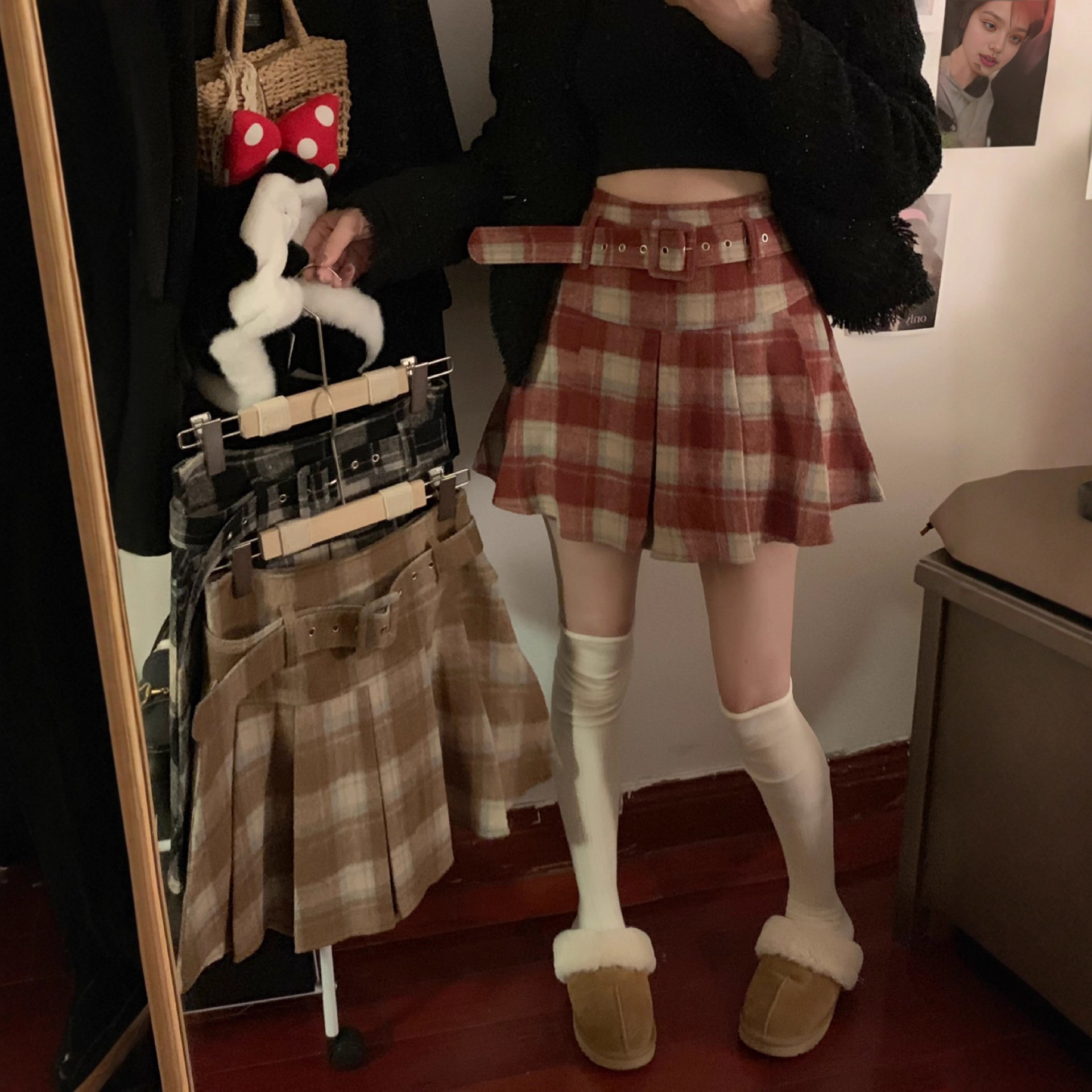 2025半身裙秋冬格子毛呢高腰红色小个子a字百褶裙短裙配腰带