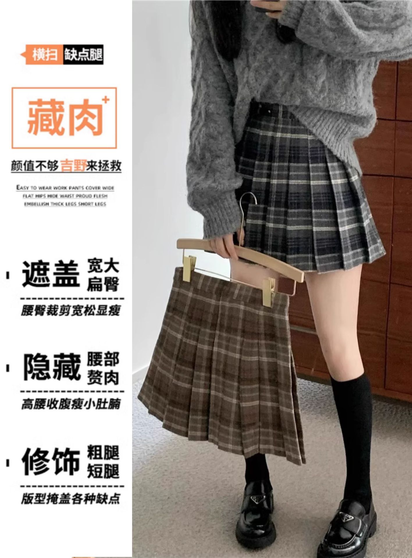 高腰格子毛呢半身裙秋冬大码学院风A字中裙适合微胖百褶裙短裙冬