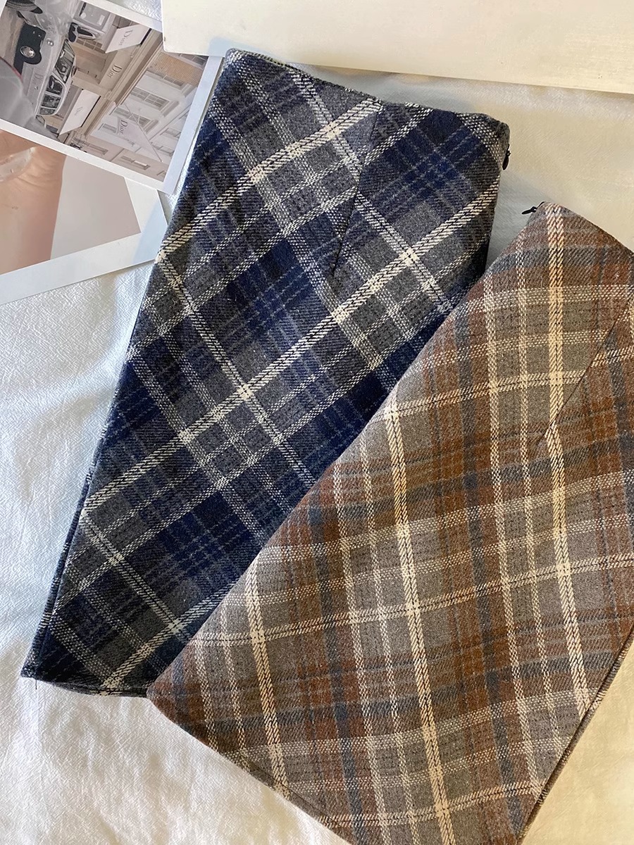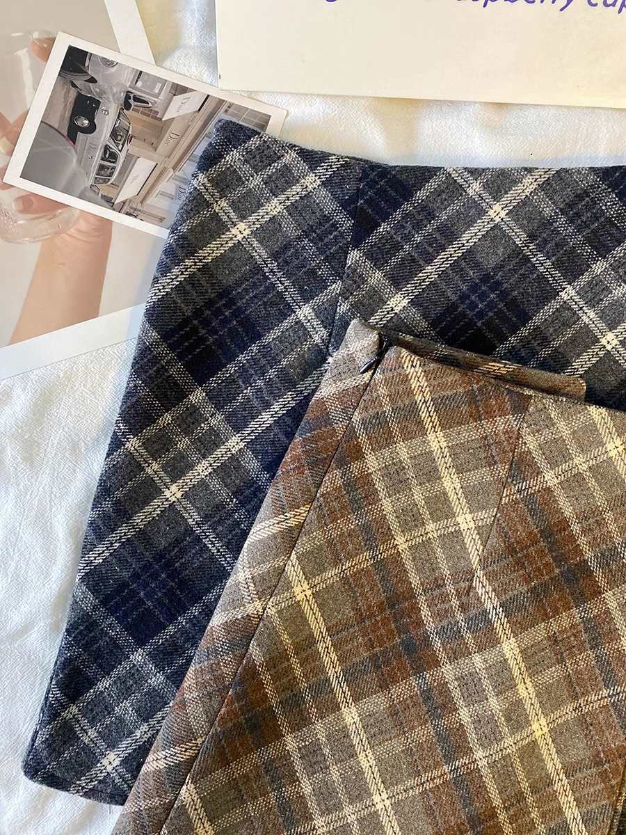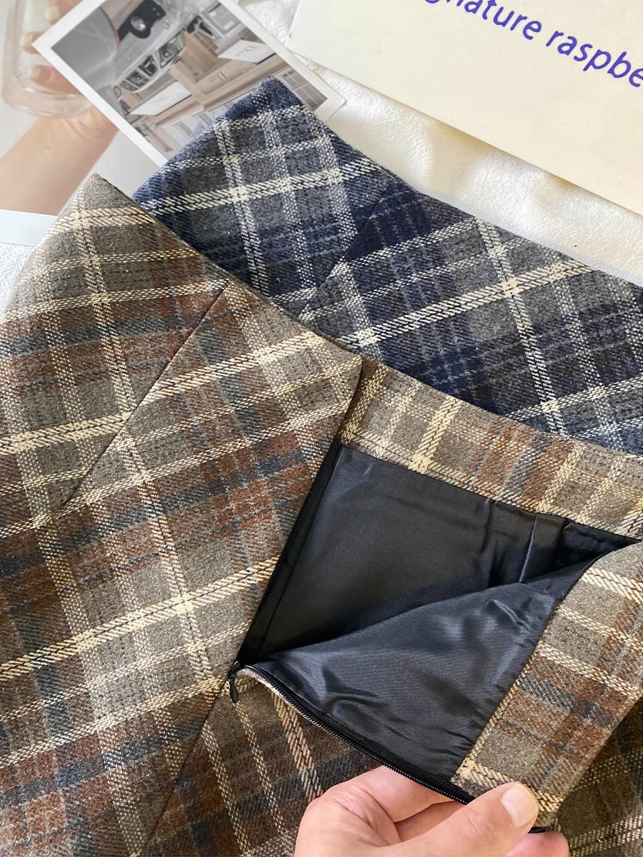 毛の格子の半身のスカートの女性の秋の冬の2024の新型の韓国版のchiは腰が高くてやせています。