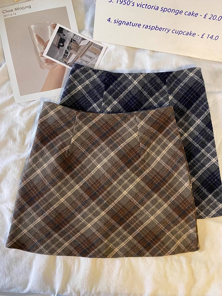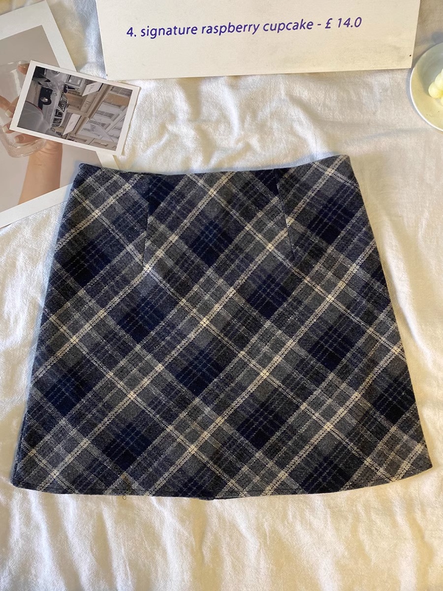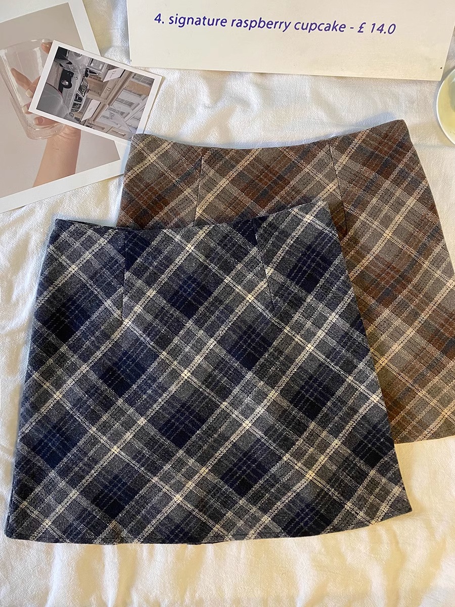 毛の格子の半身のスカートの女性の秋の冬の2024の新型の韓国版のchiは腰が高くてやせています。